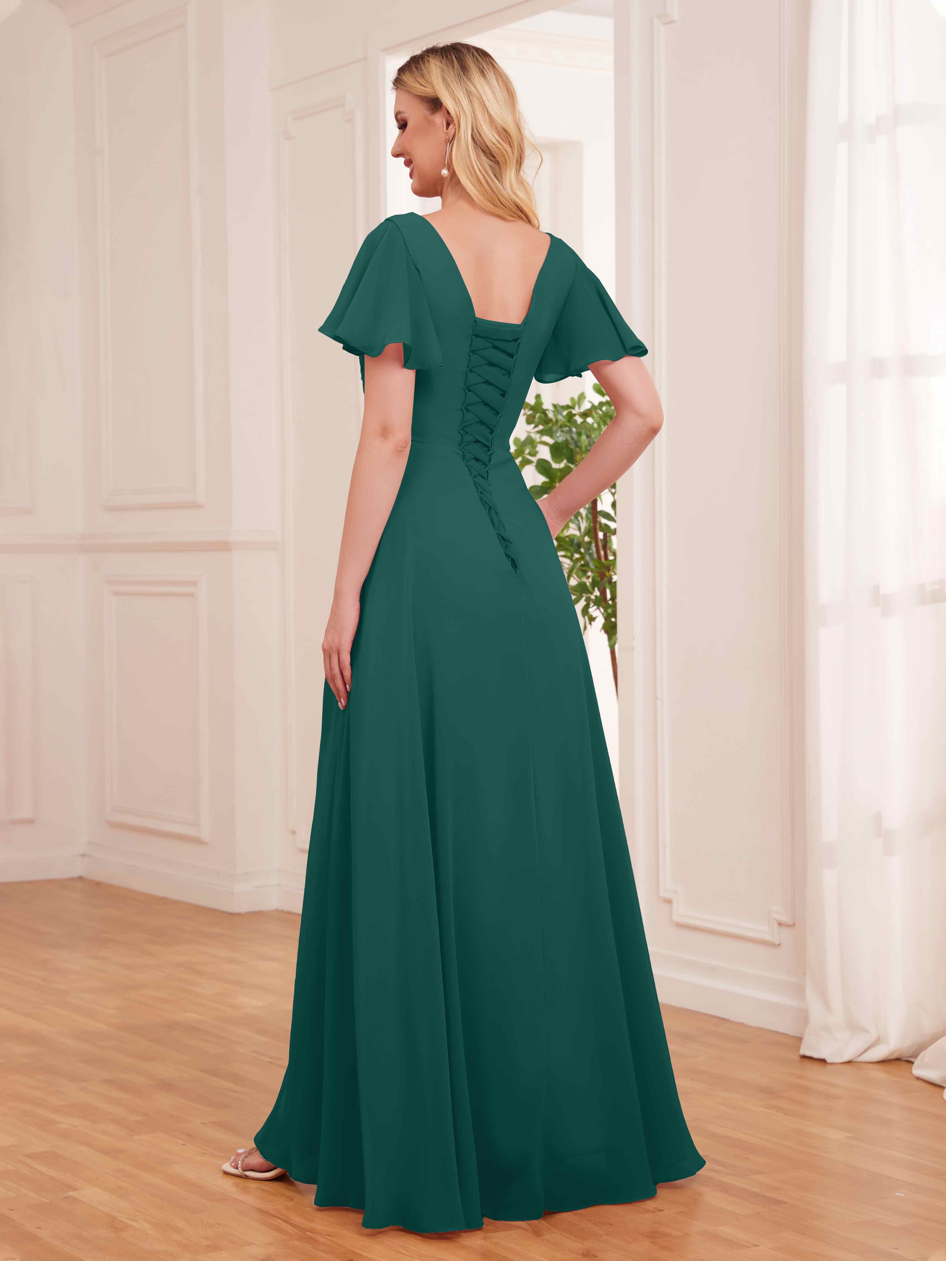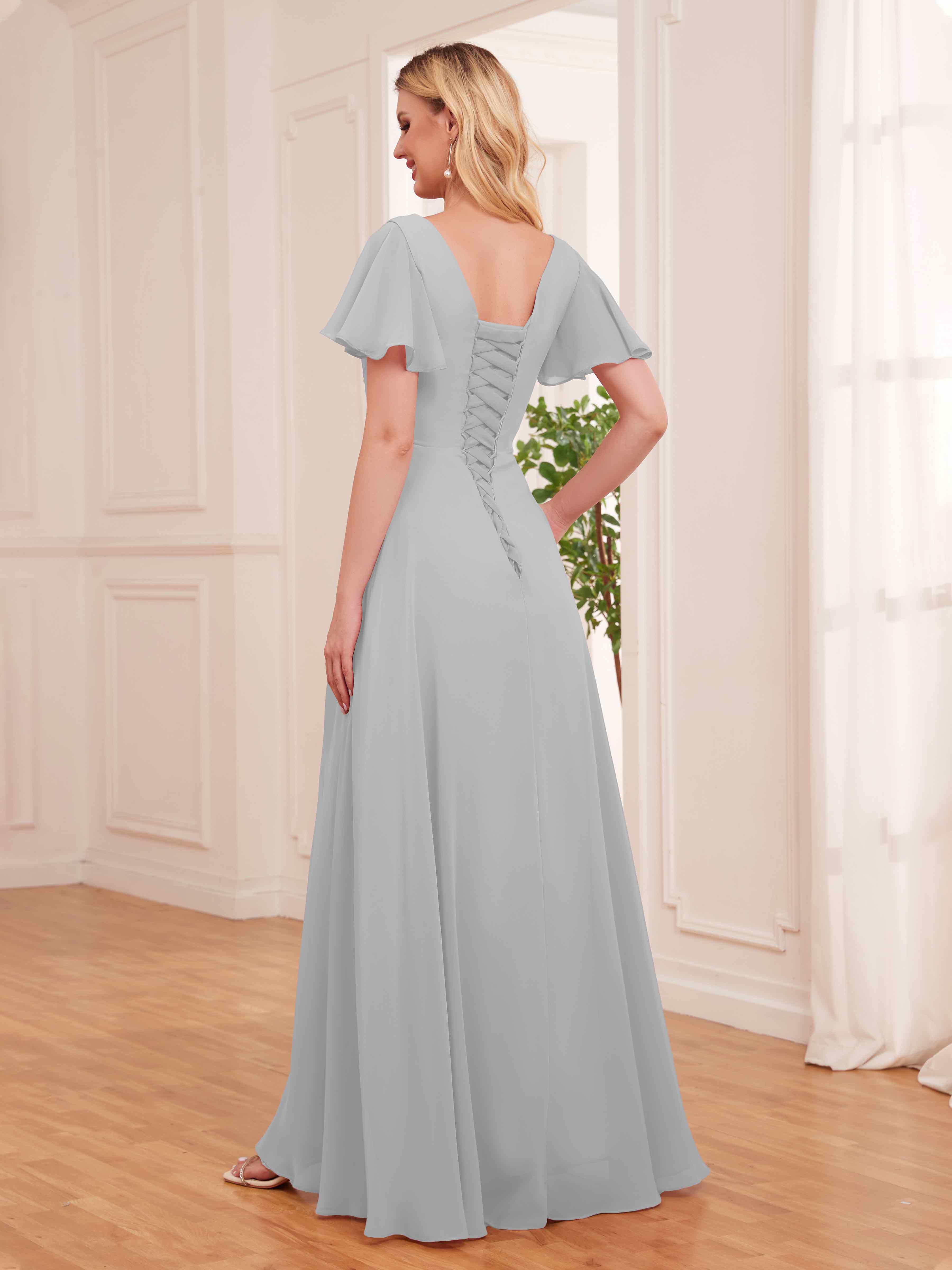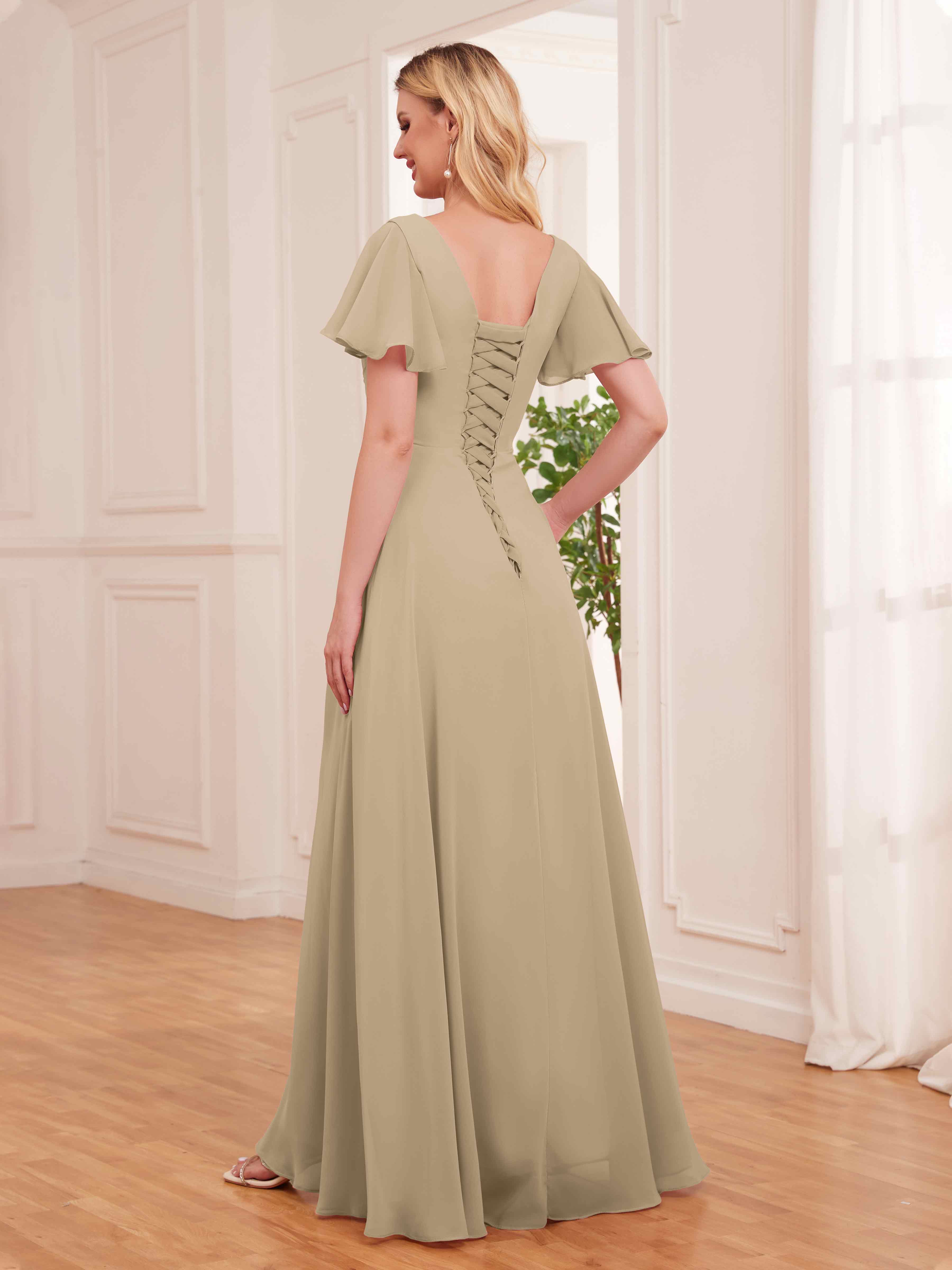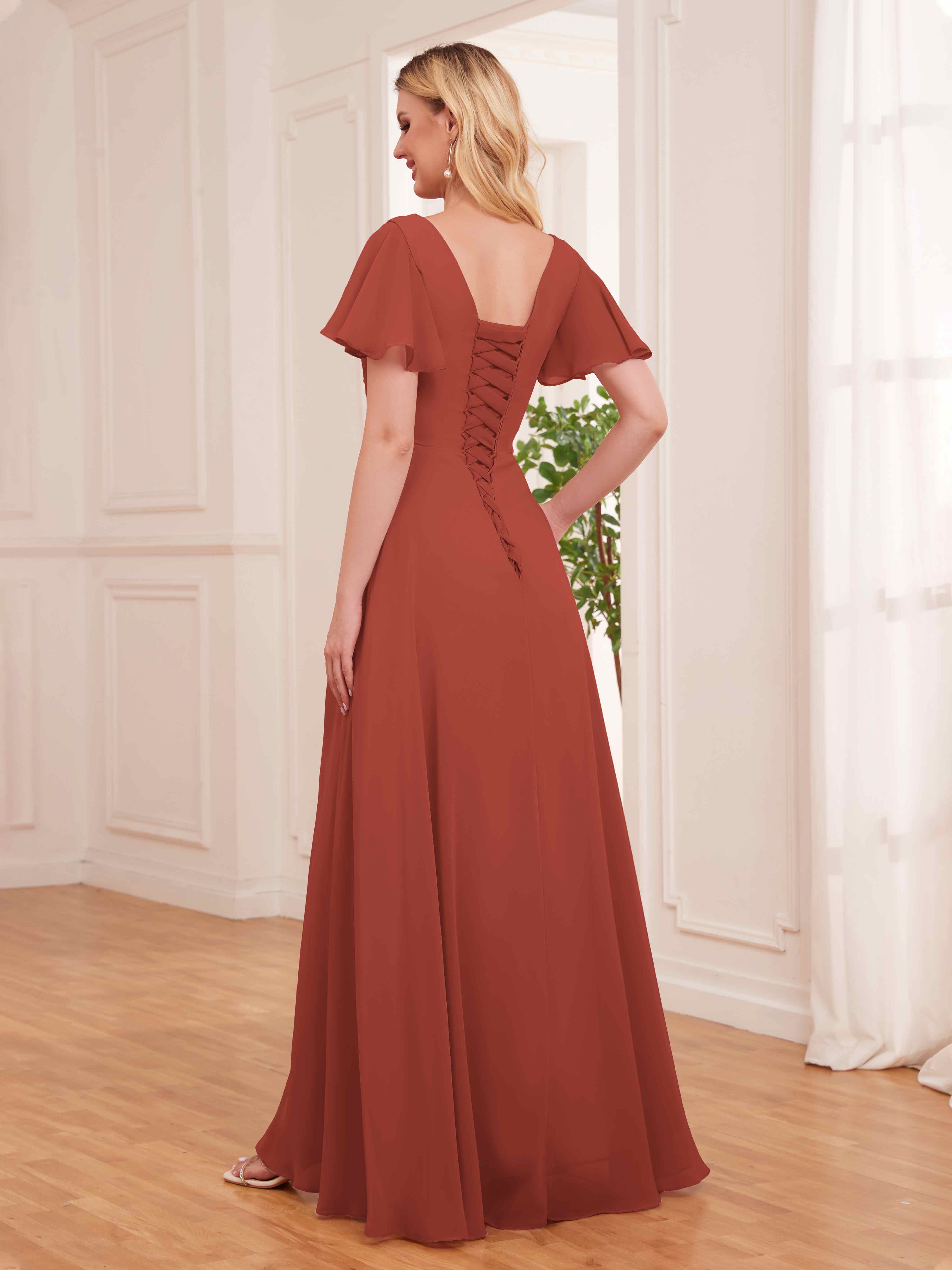 River Modest V Neck Ruched Floor Length Chiffon Bridesmaid Dresses