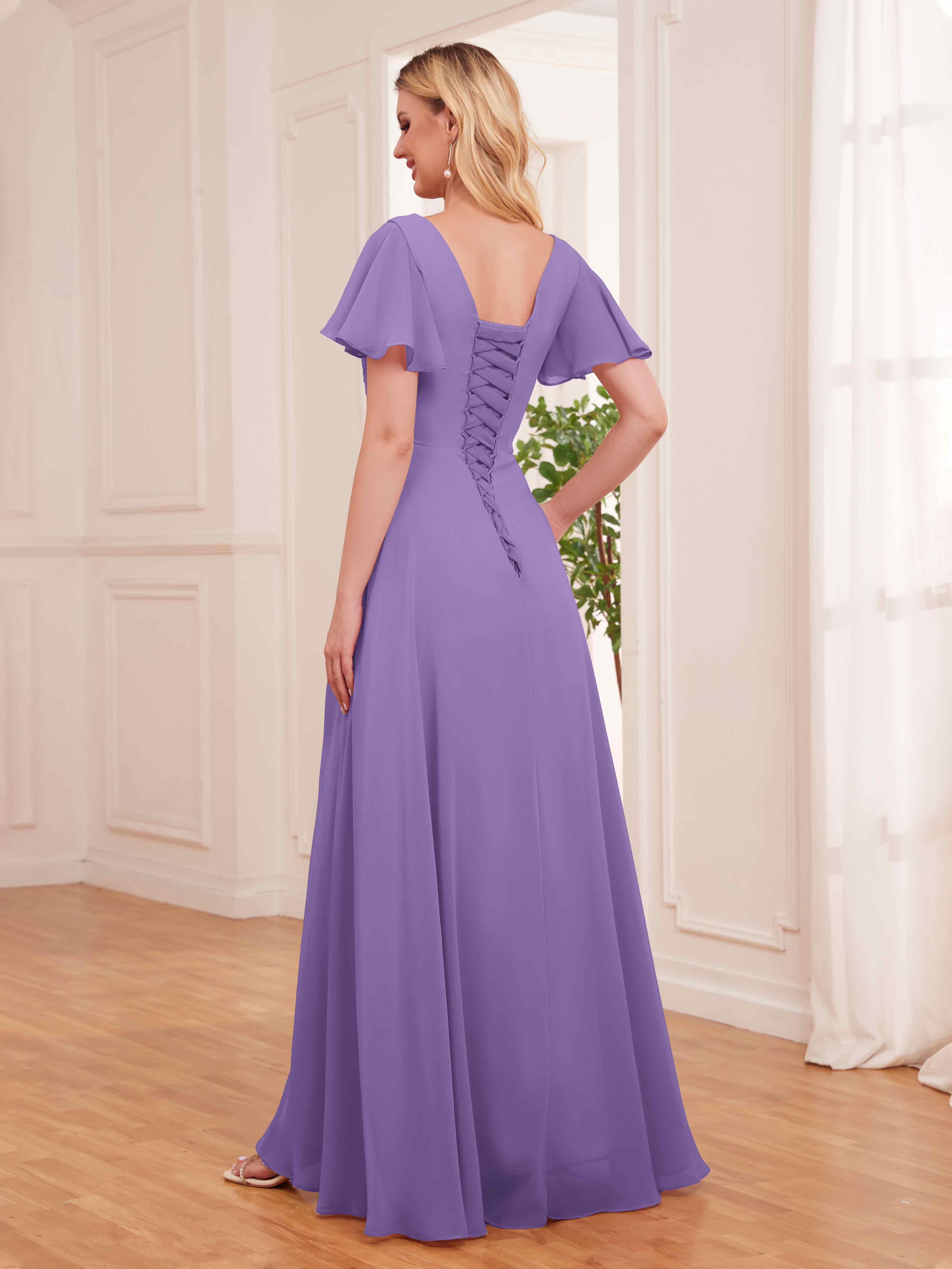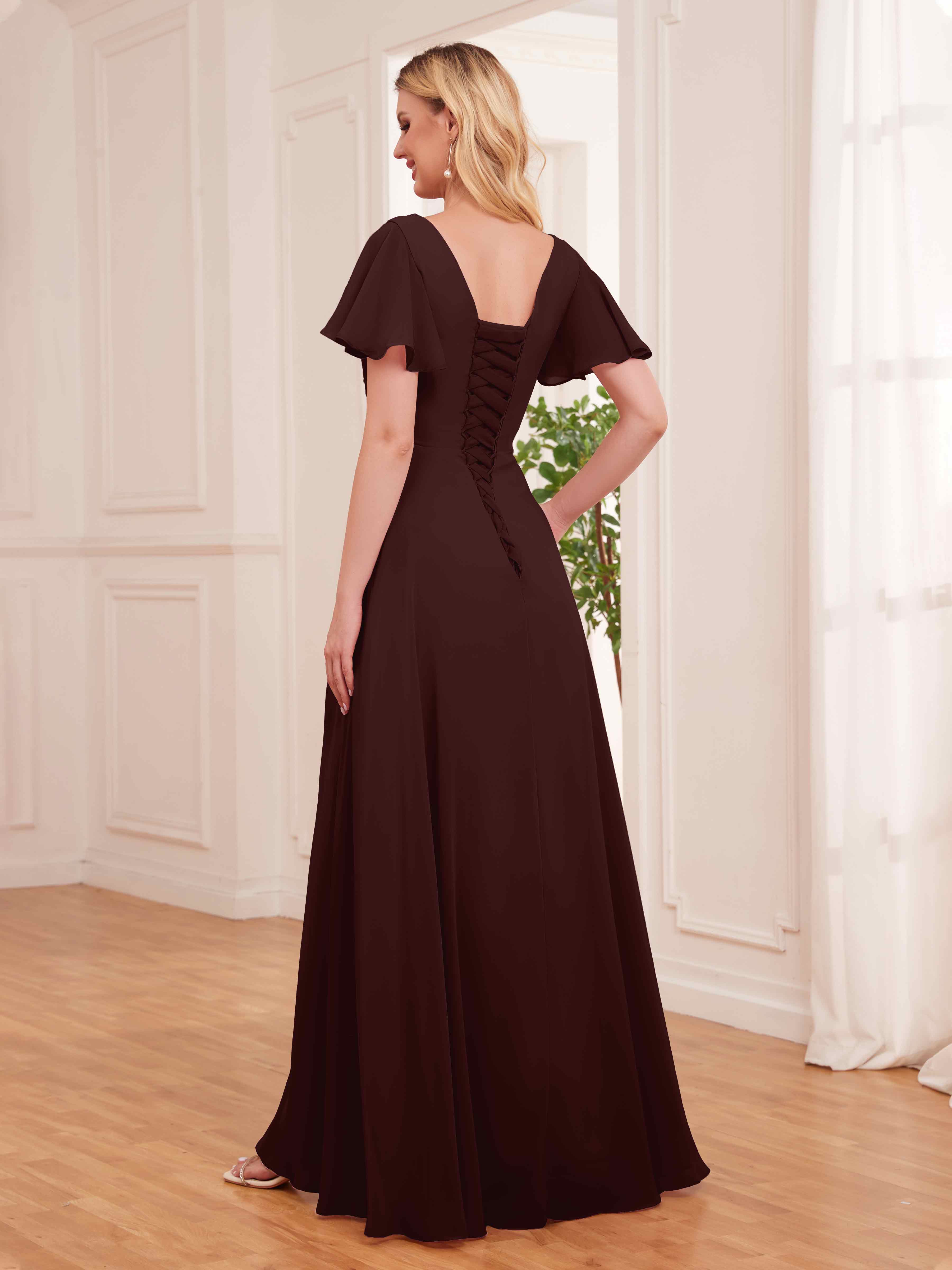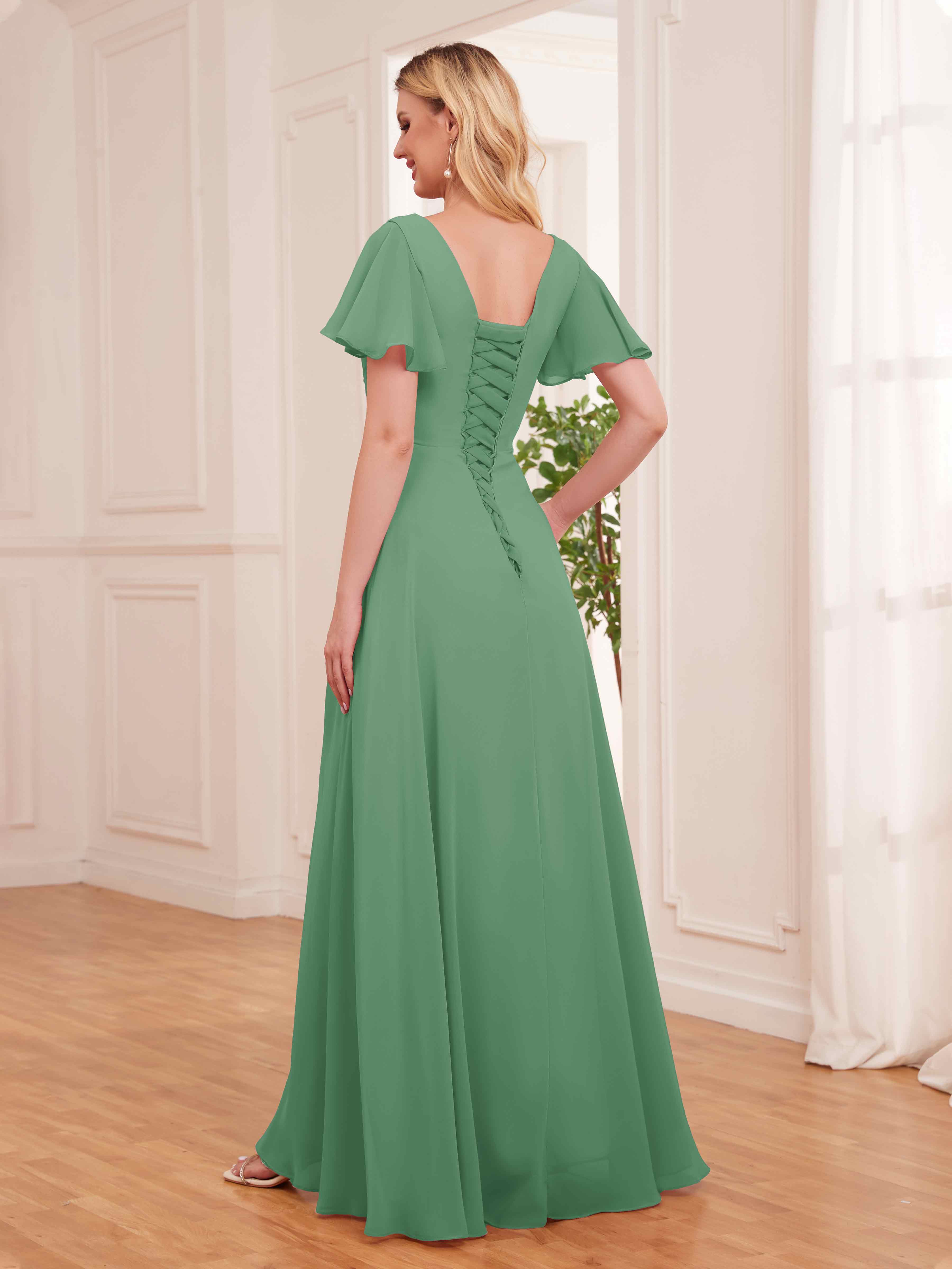 River Modest V Neck Ruched Floor Length Chiffon Bridesmaid Dresses