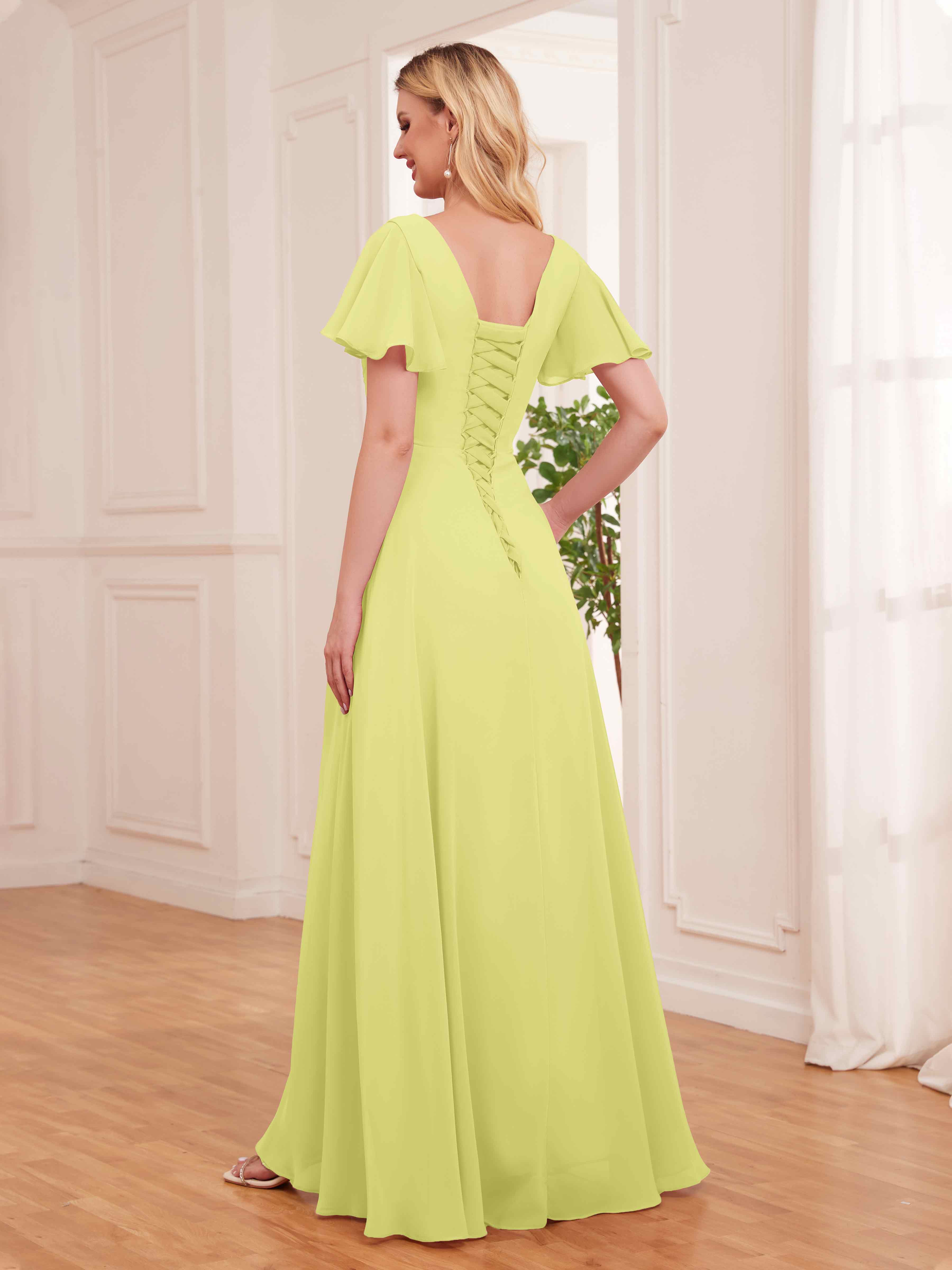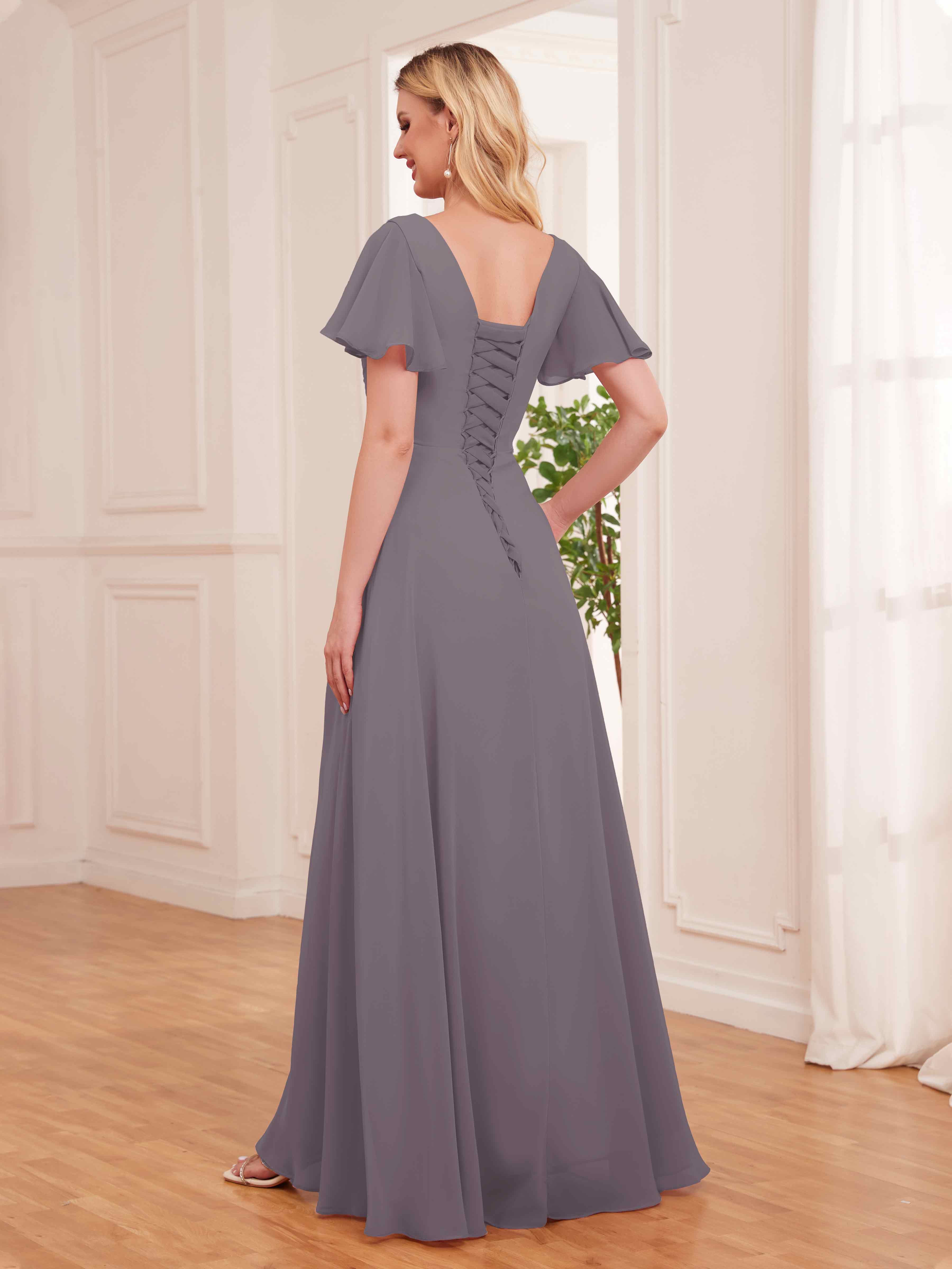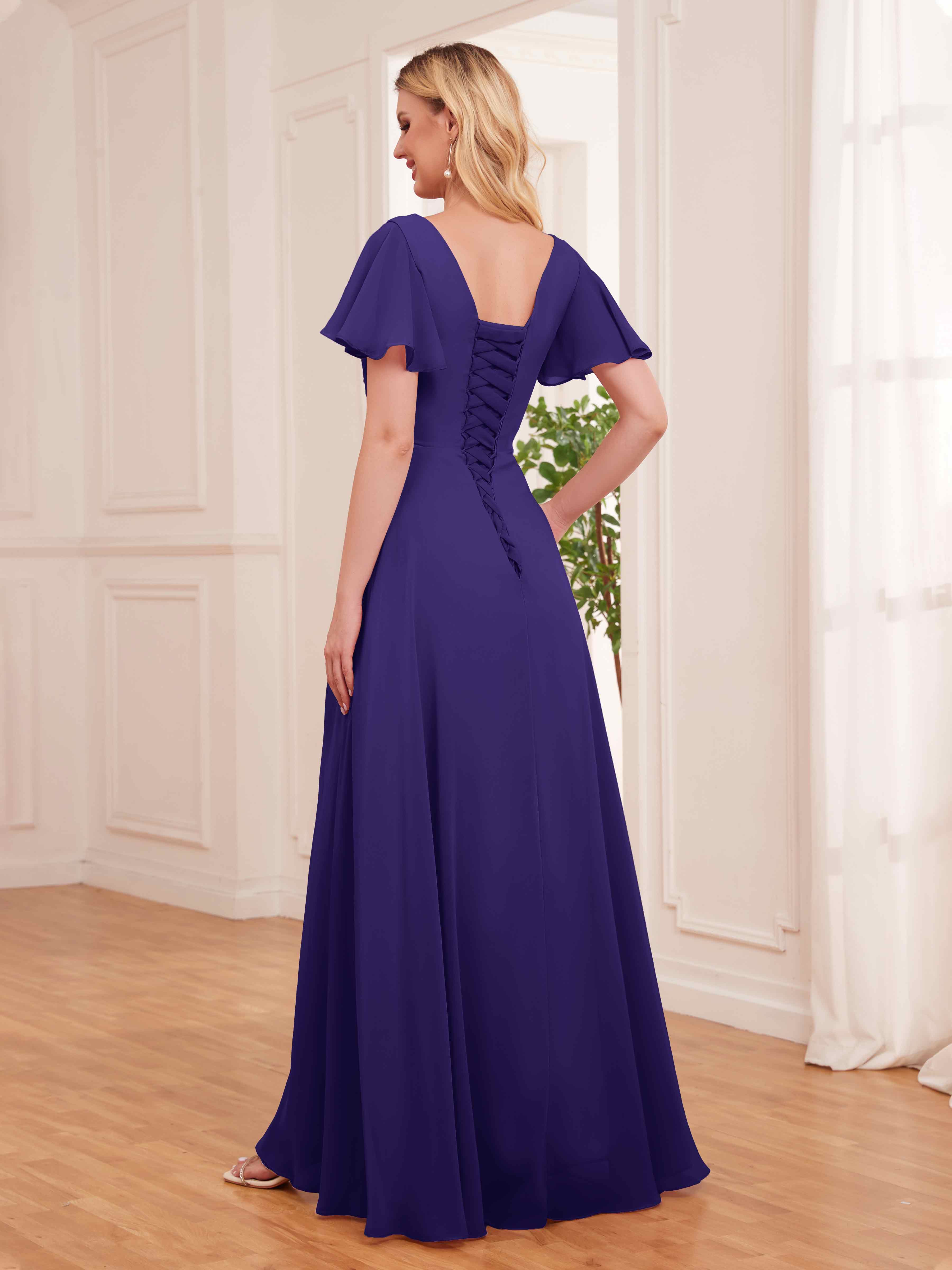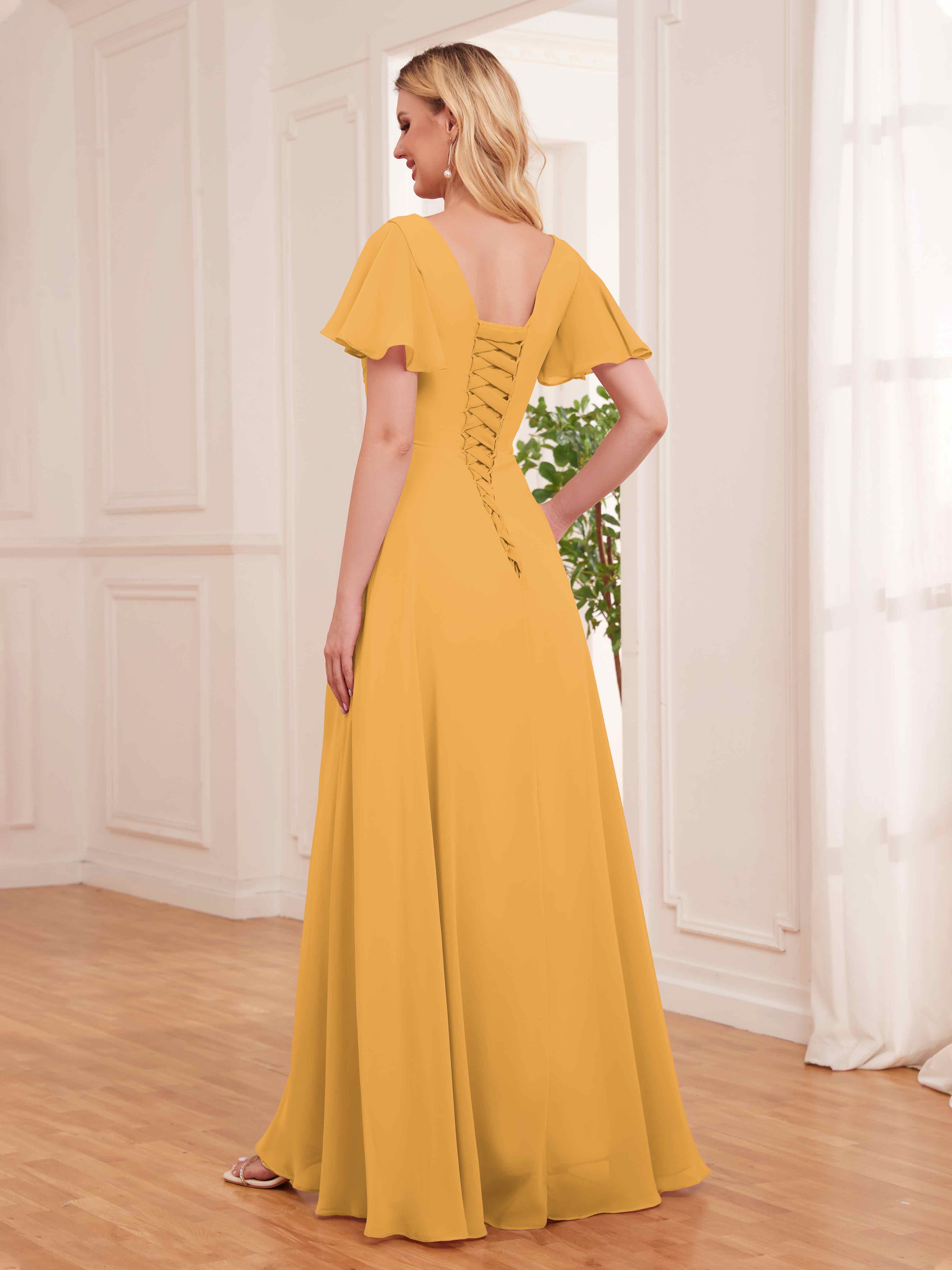 River Modest V Neck Ruched Floor Length Chiffon Bridesmaid Dresses