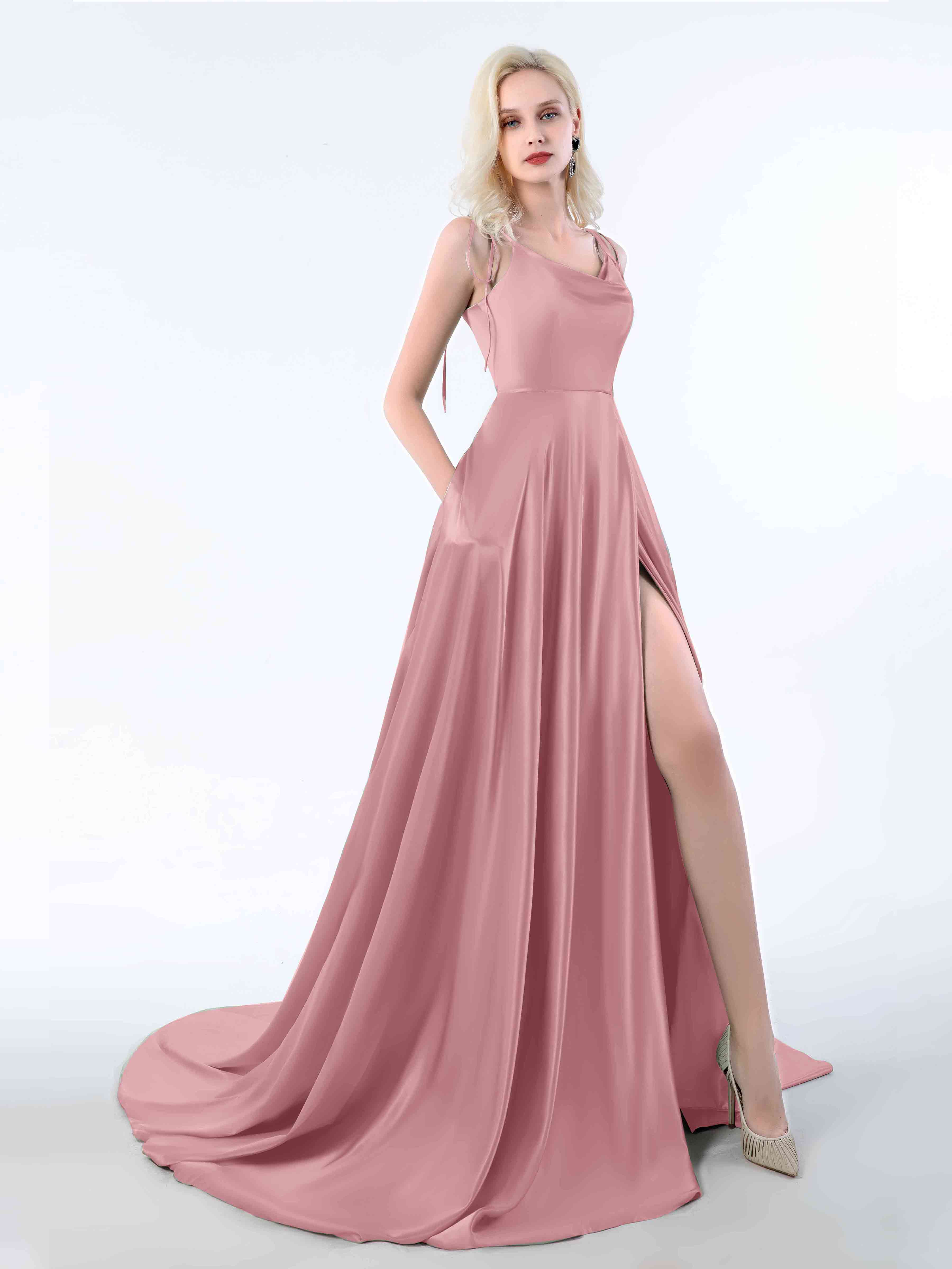 Elevate your evening wear with the Rosalie dress. This enchanting design boasts a cowl neckline, corset-inspired back, and sumptuous satin fabric. Ideal for formal gatherings, this dress is sure to make a striking impression and turn heads. Get it and embody the epitome of refinement and poise.