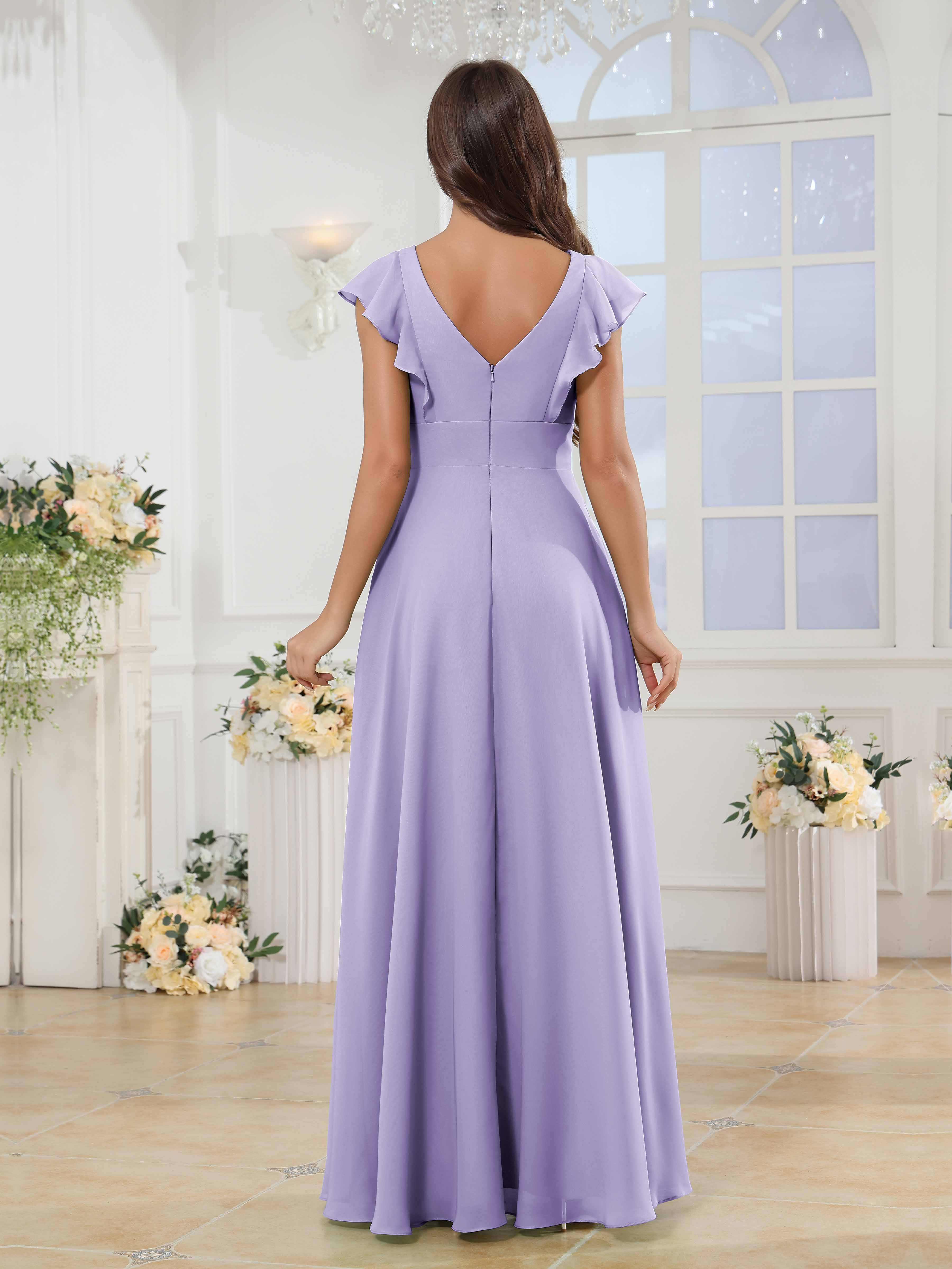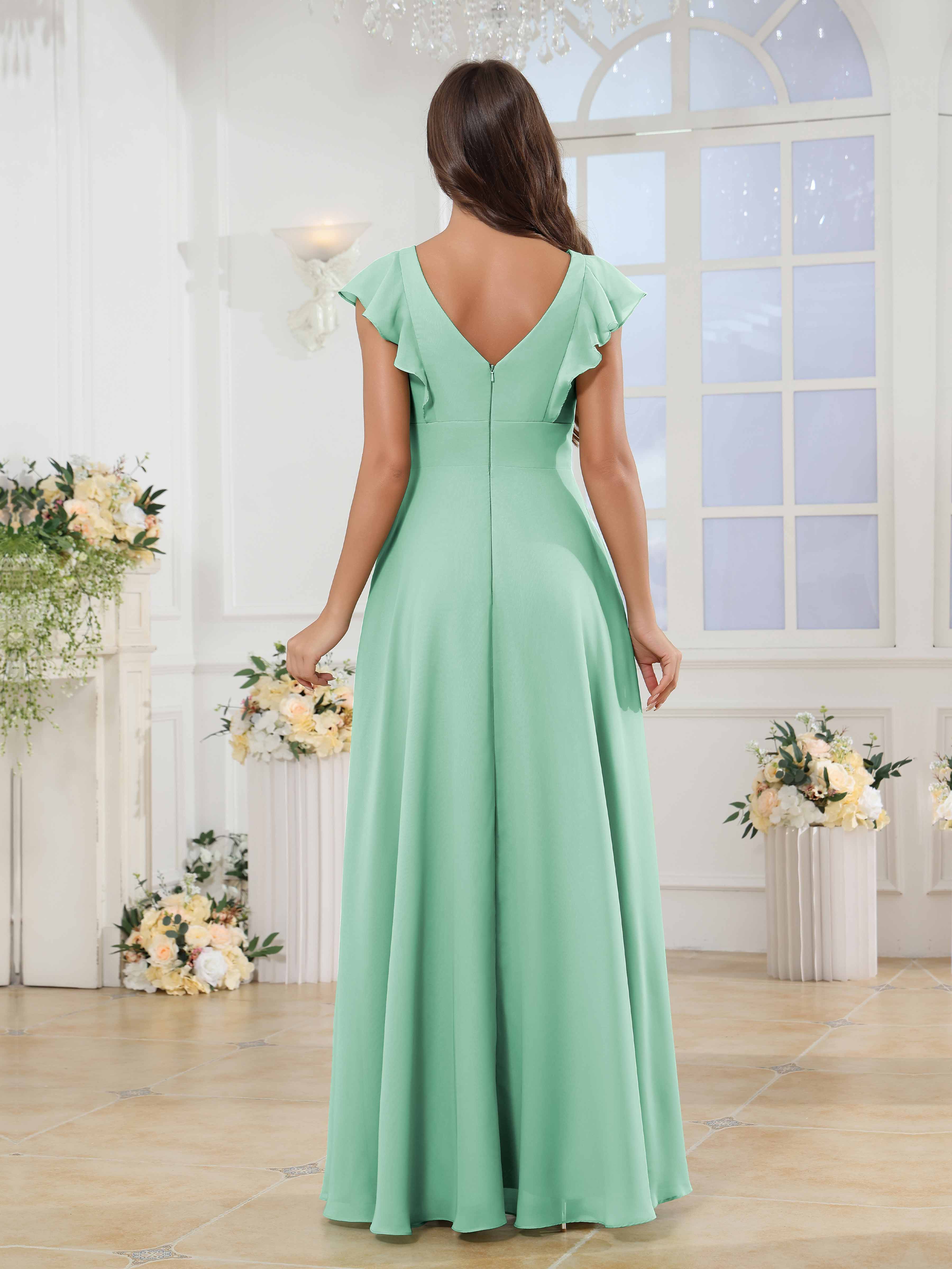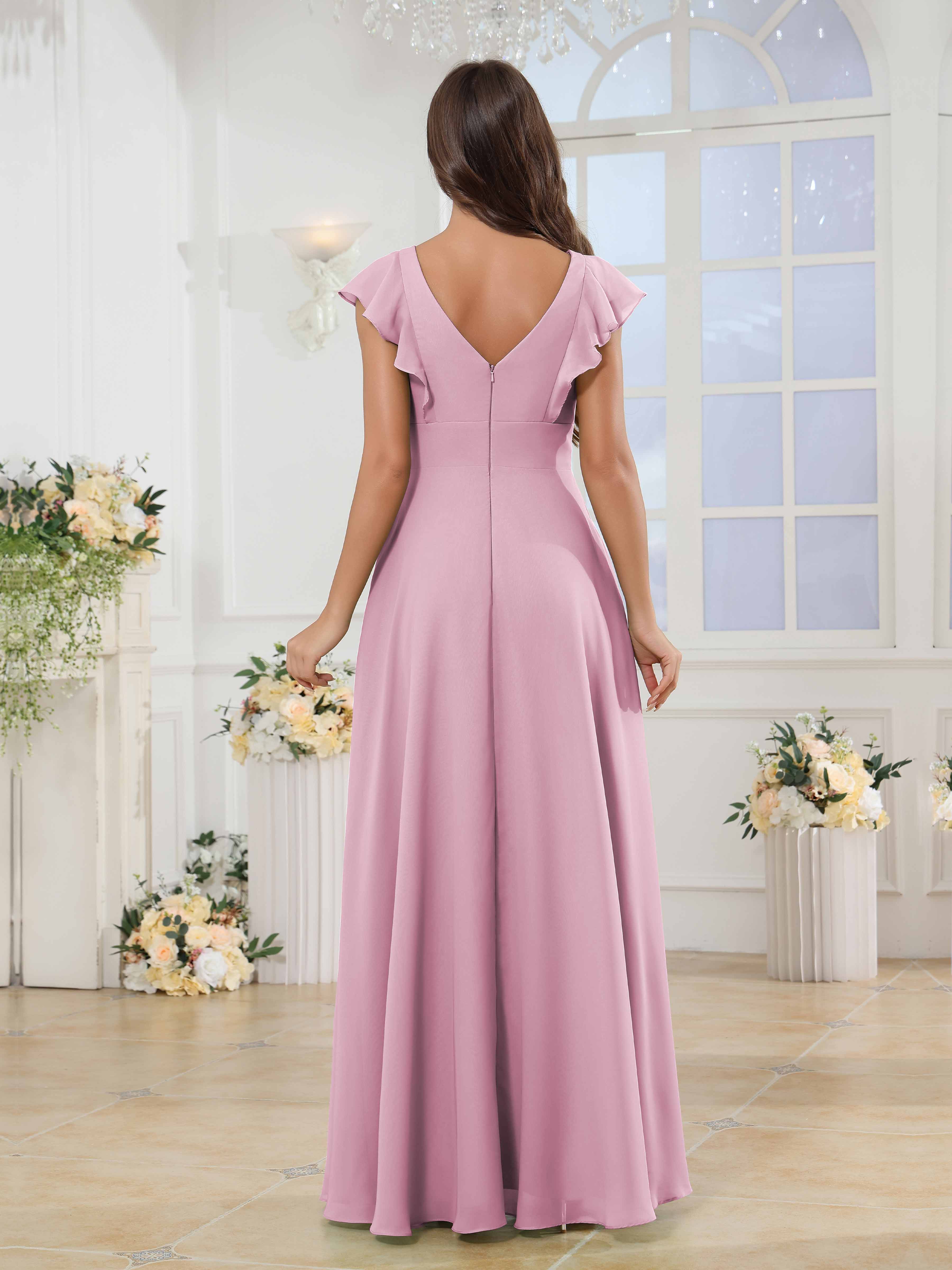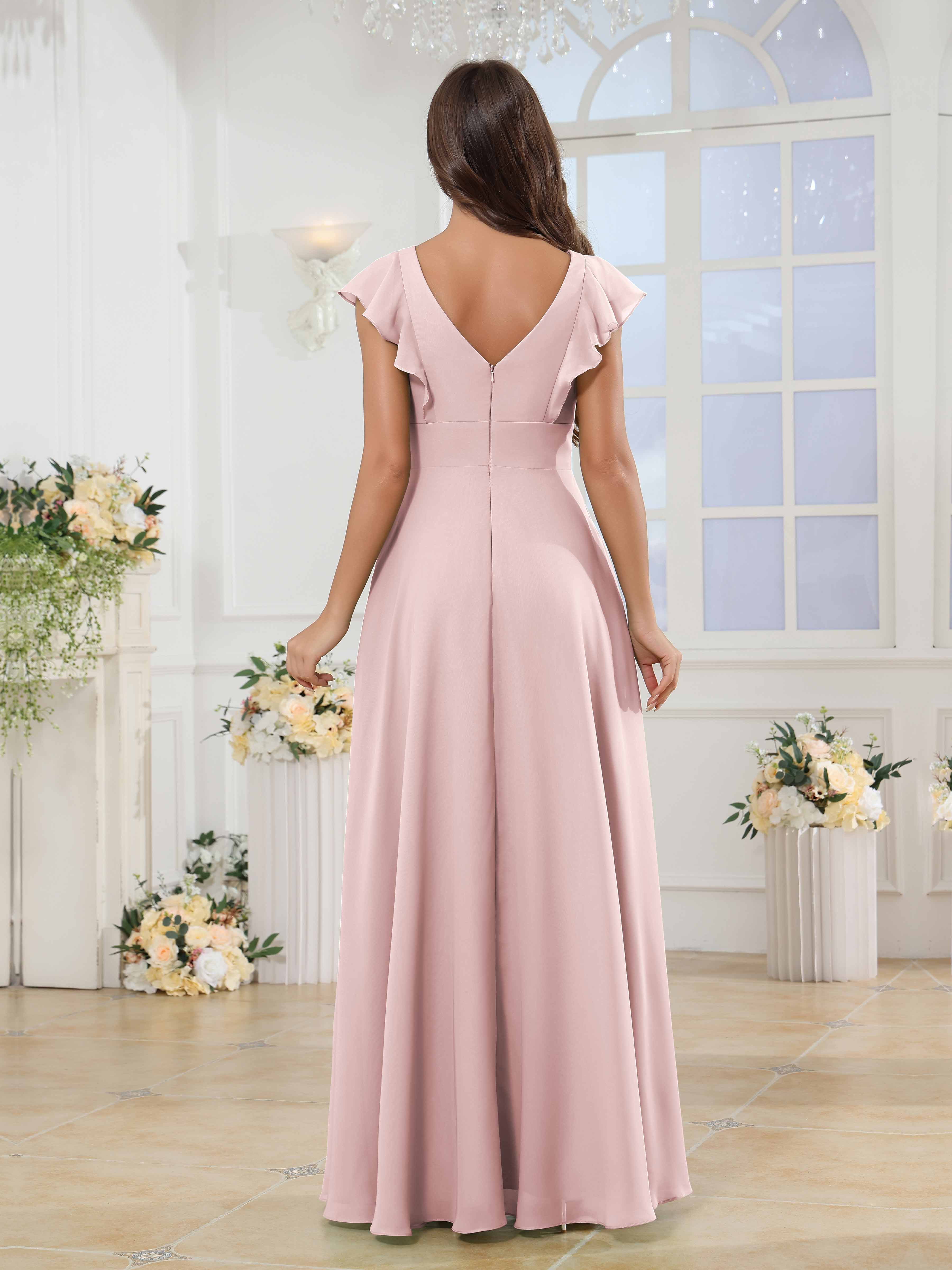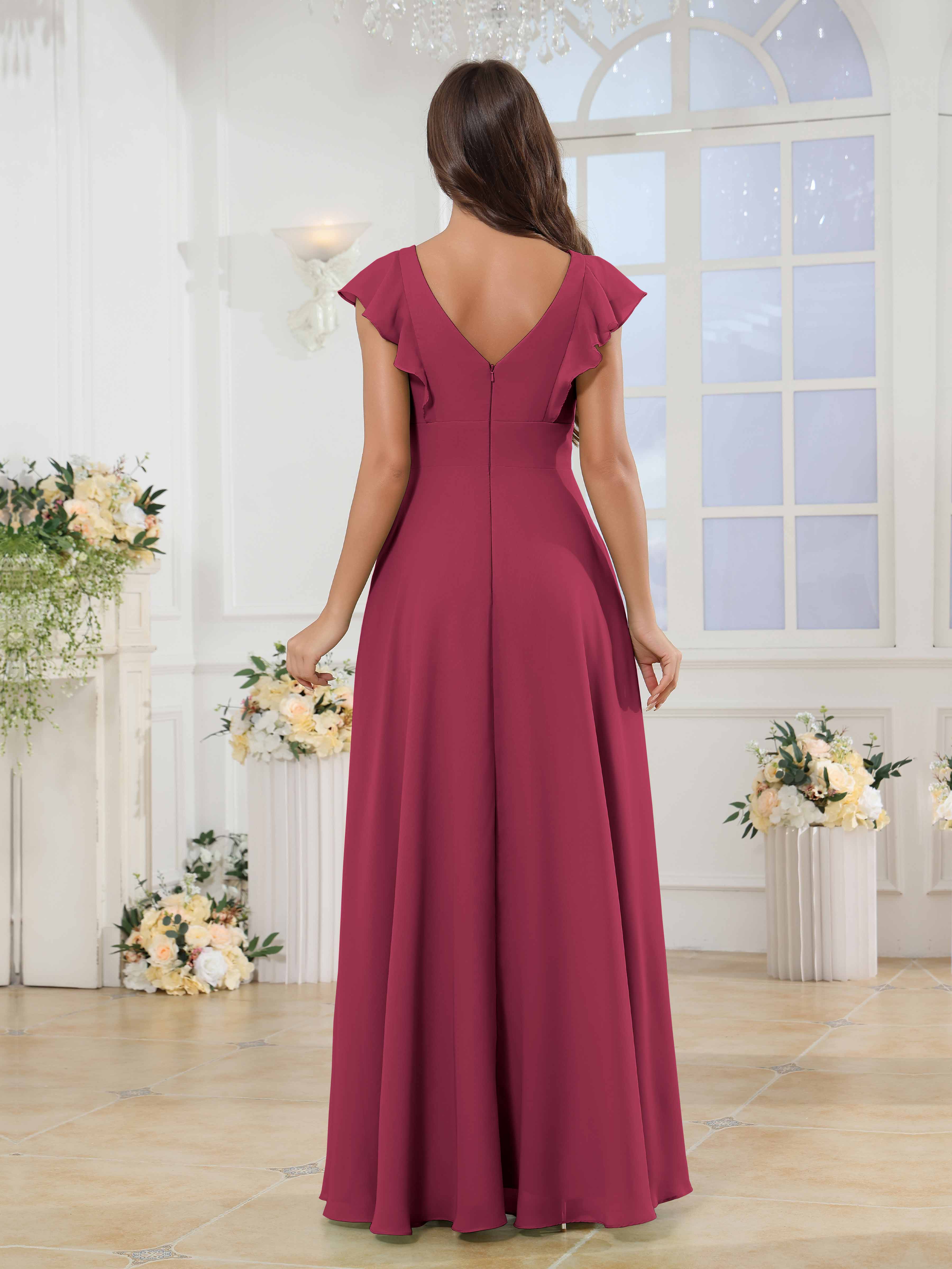 Roselyn Trendy V-Neck Ruffles Long Chiffon Bridesmaid Dresses With Pockets