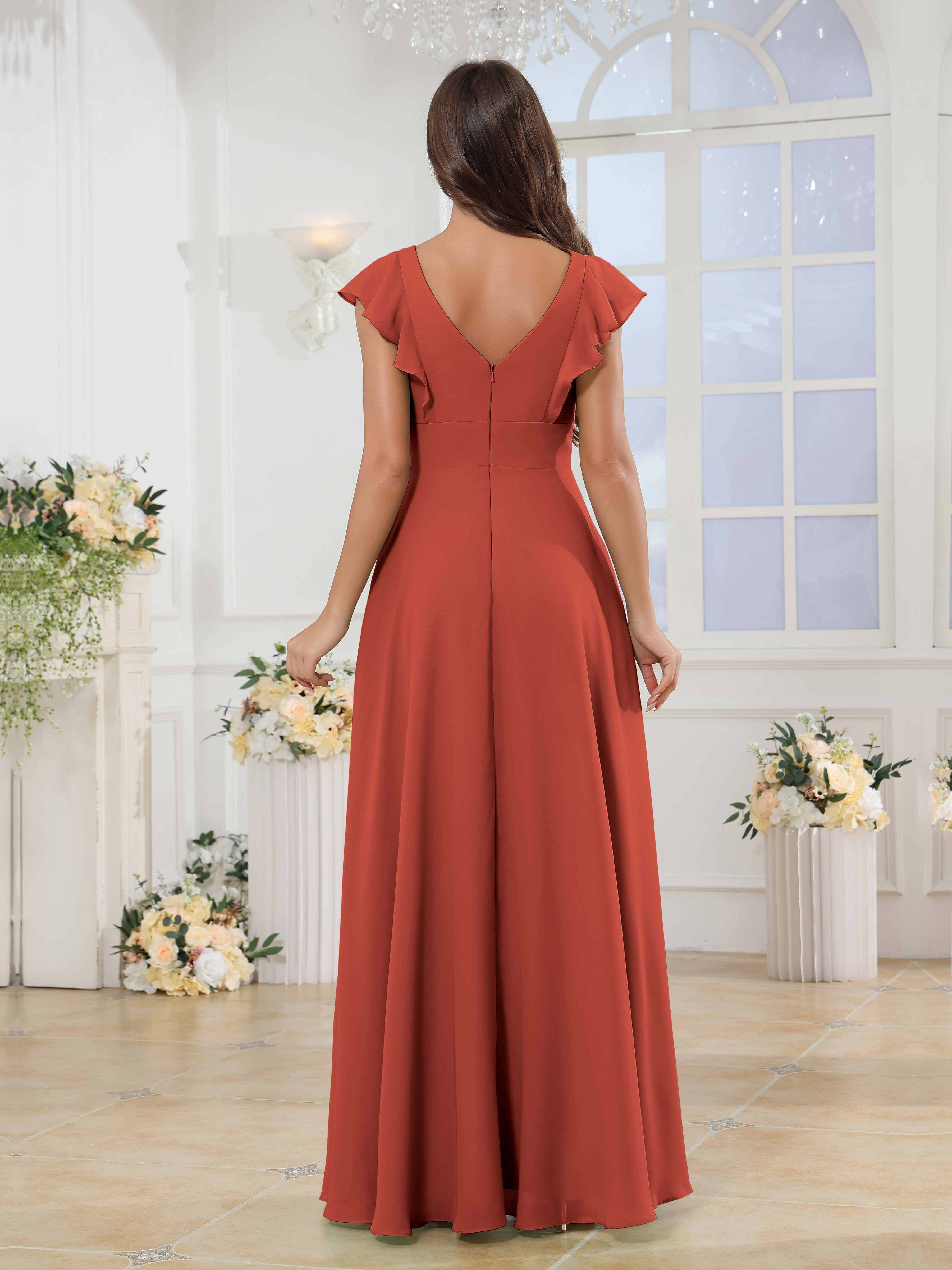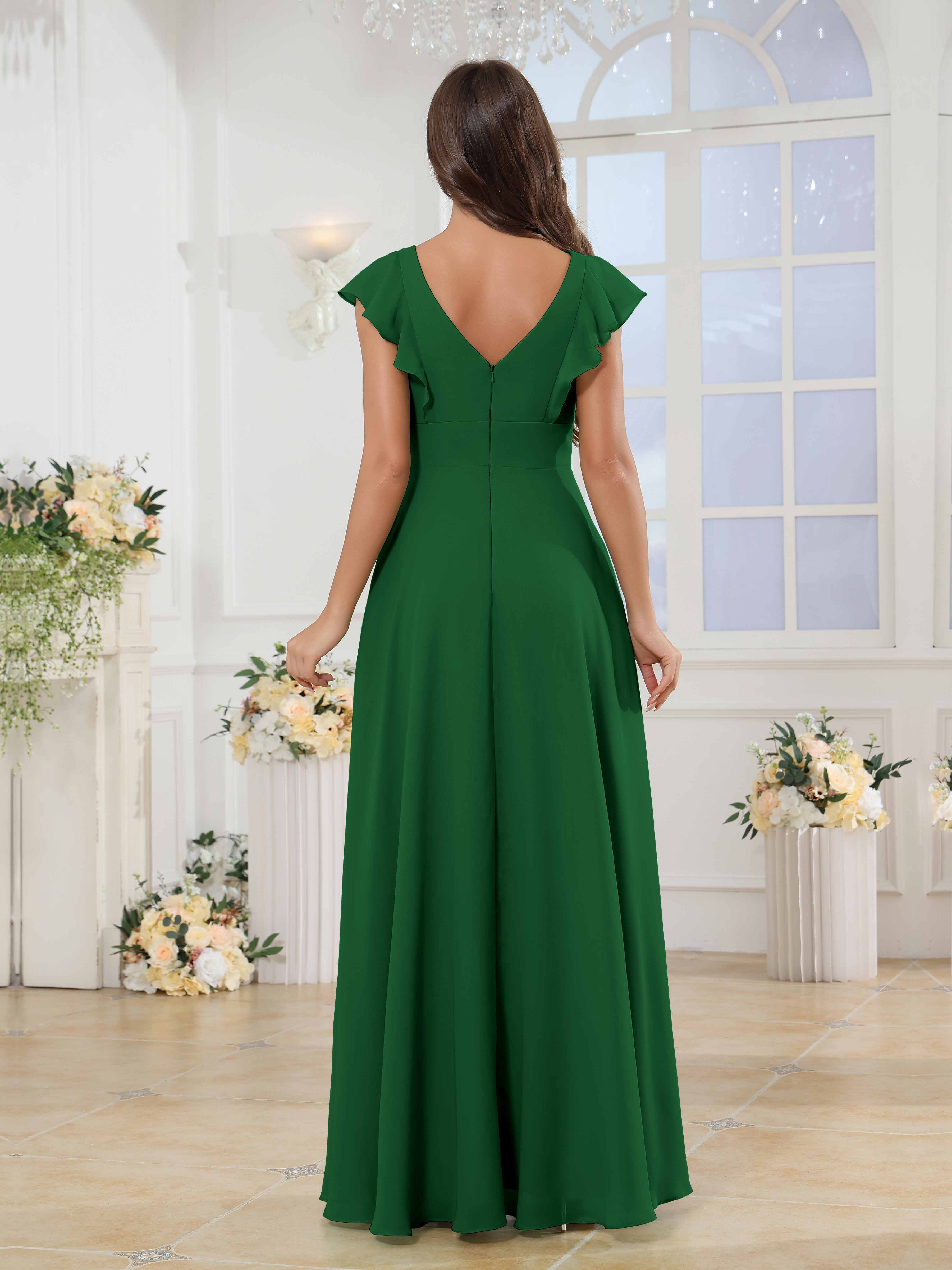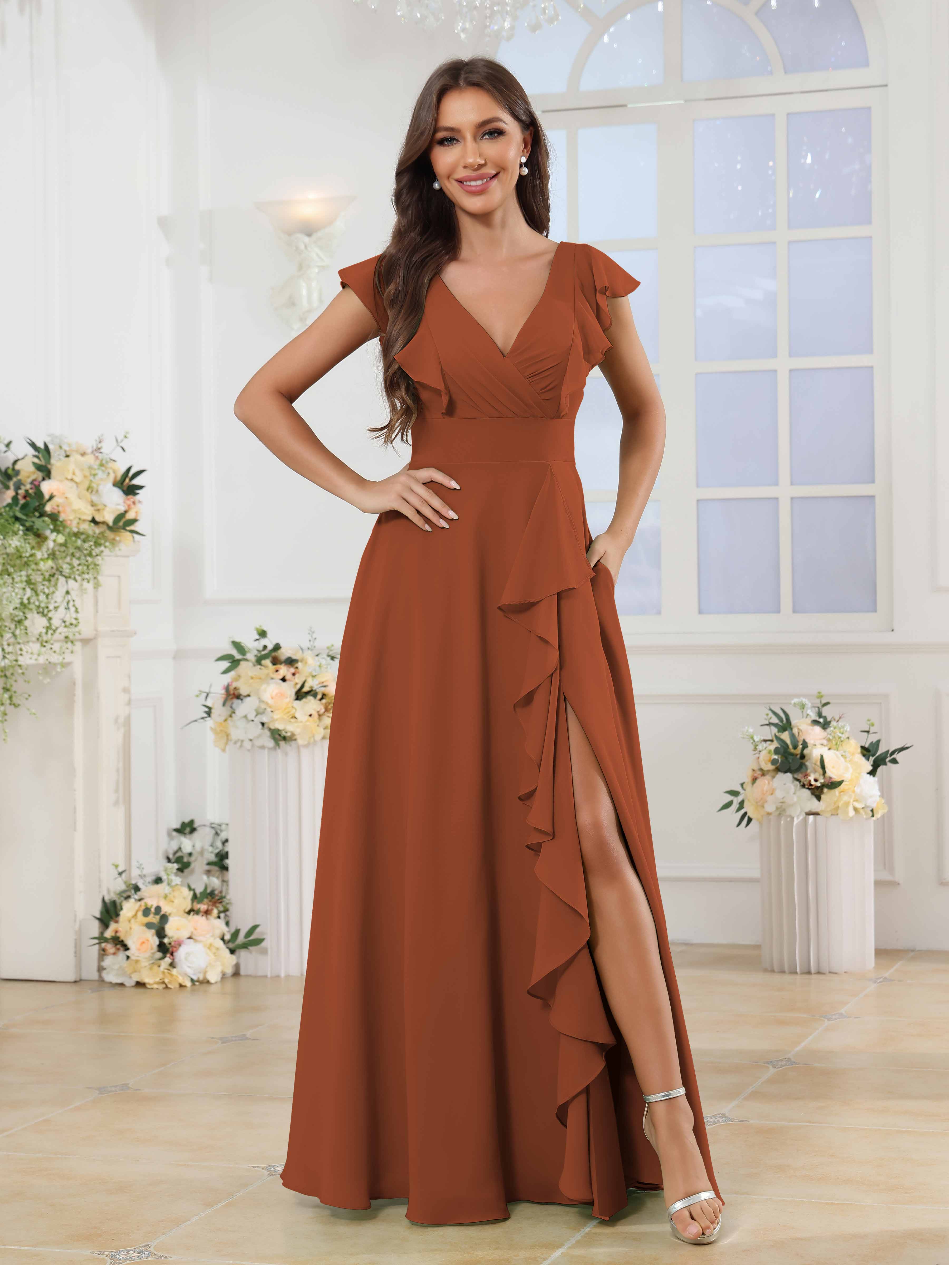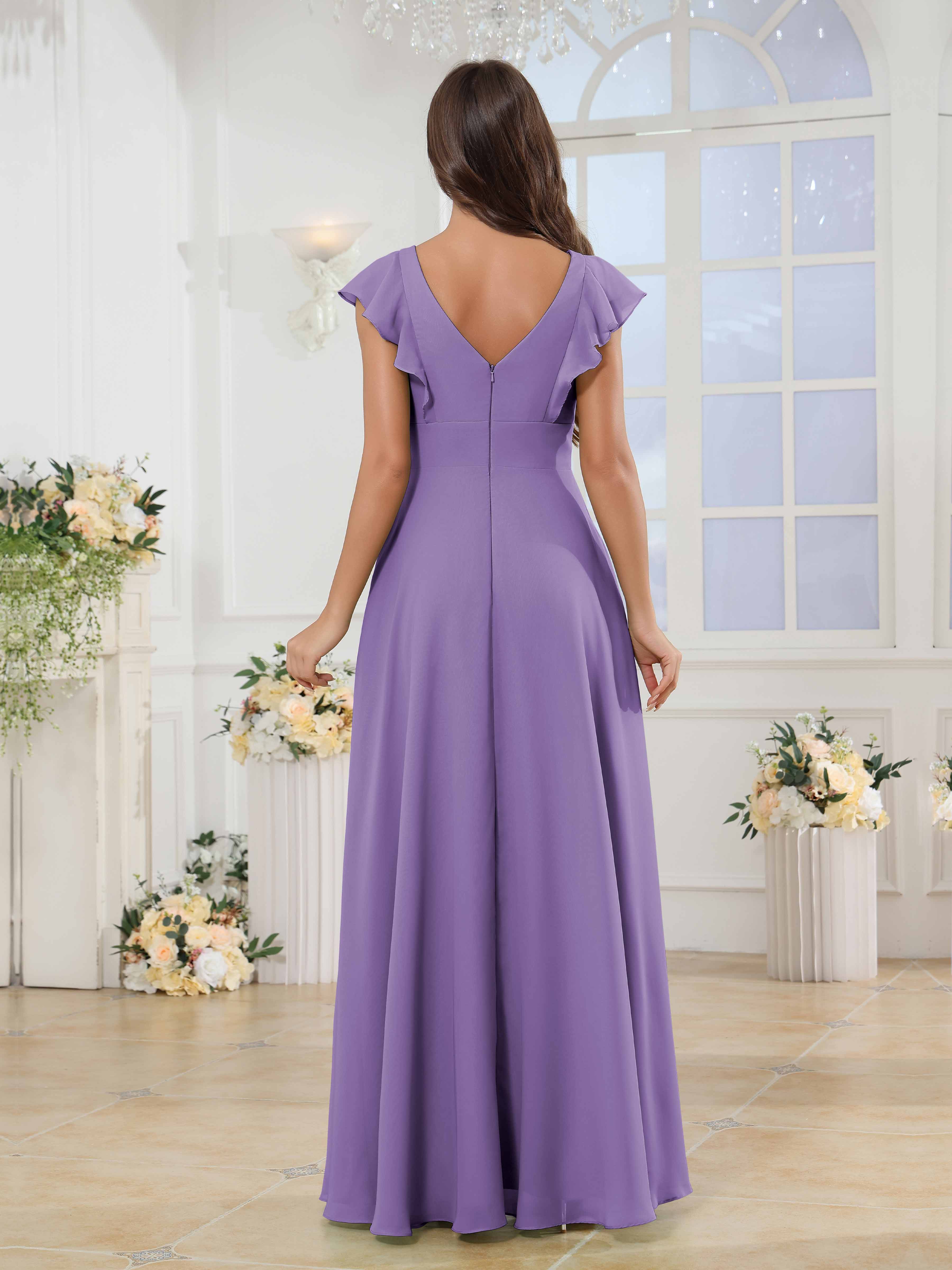 Roselyn Trendy V-Neck Ruffles Long Chiffon Bridesmaid Dresses With Pockets