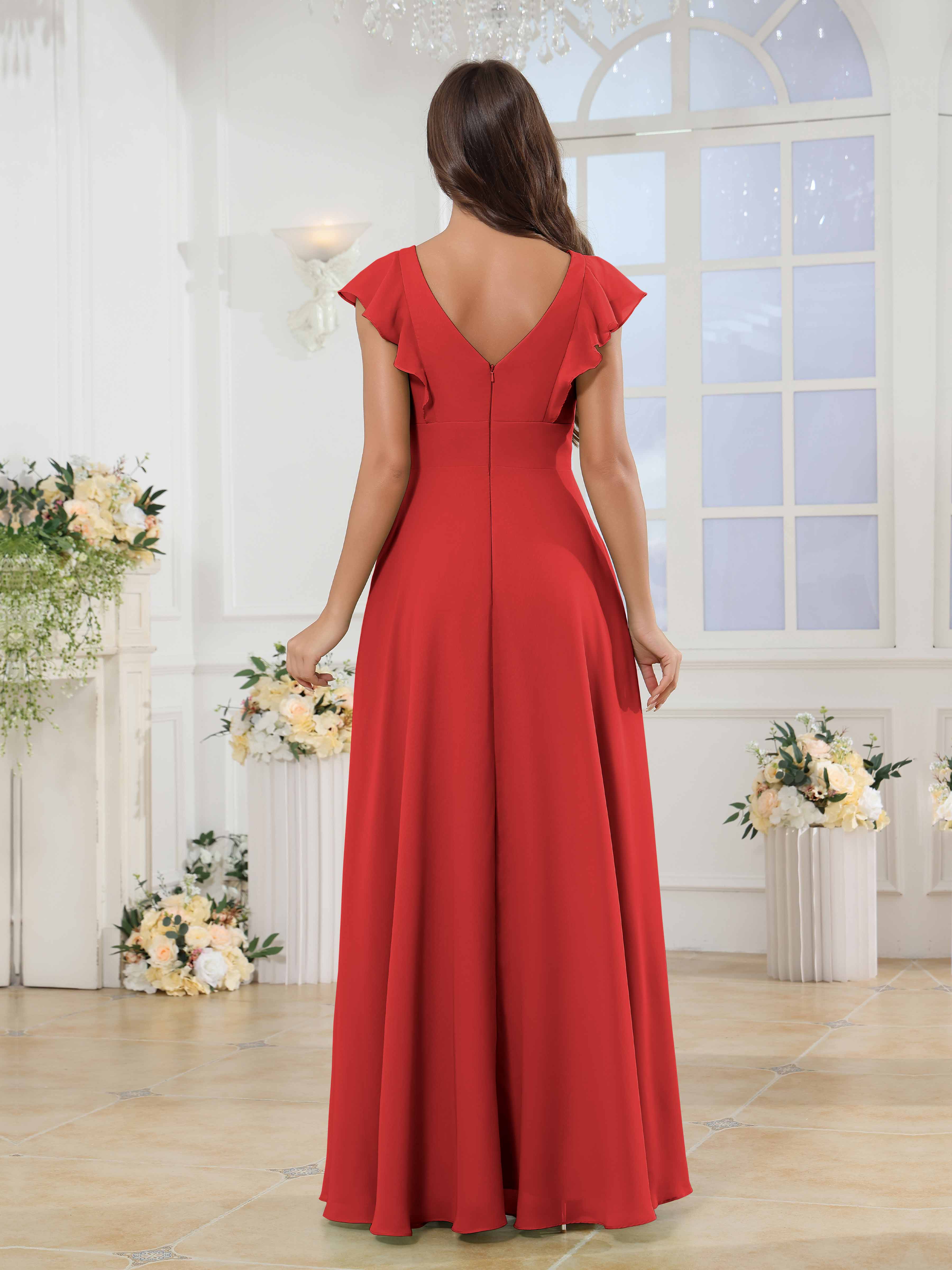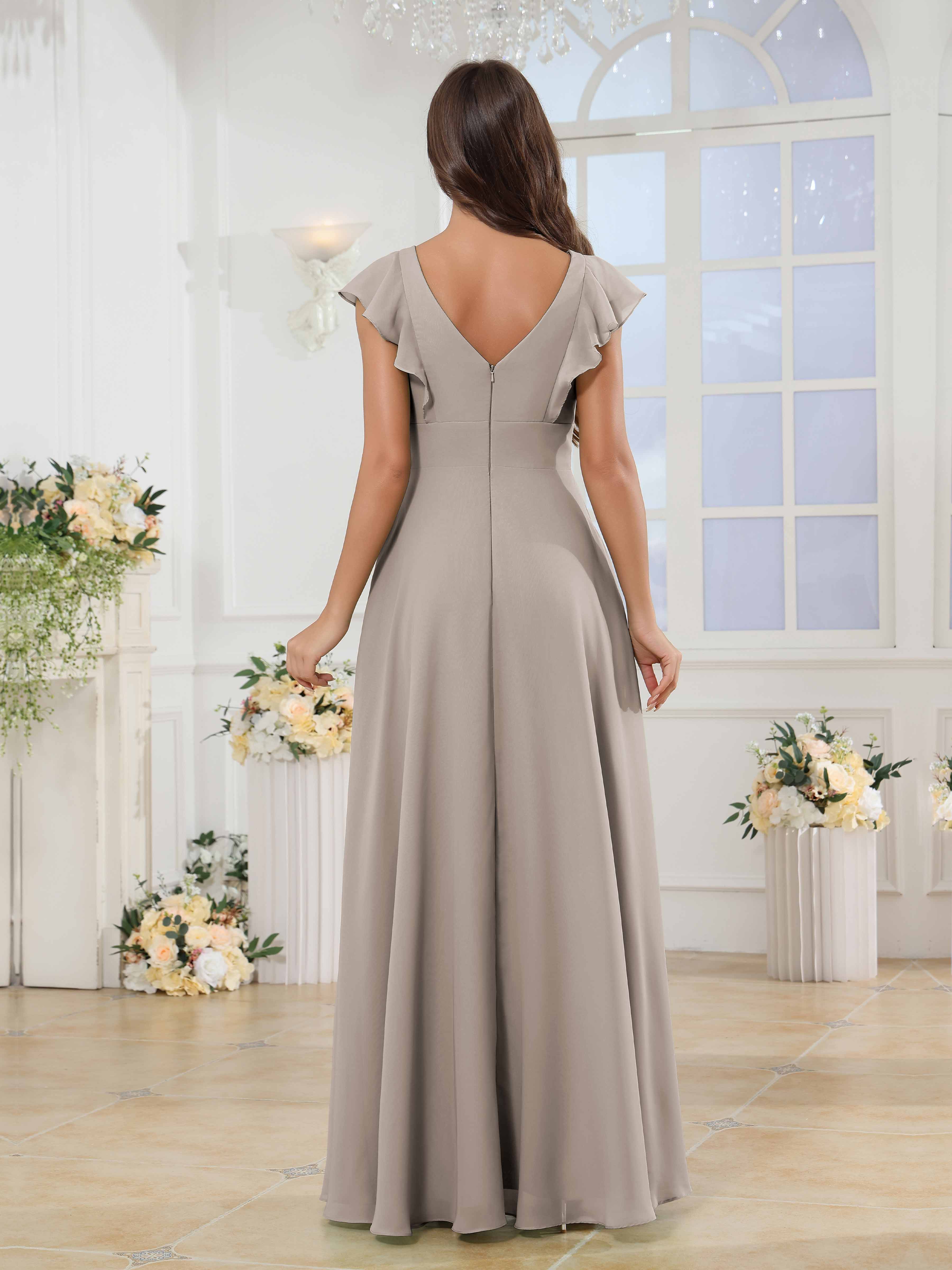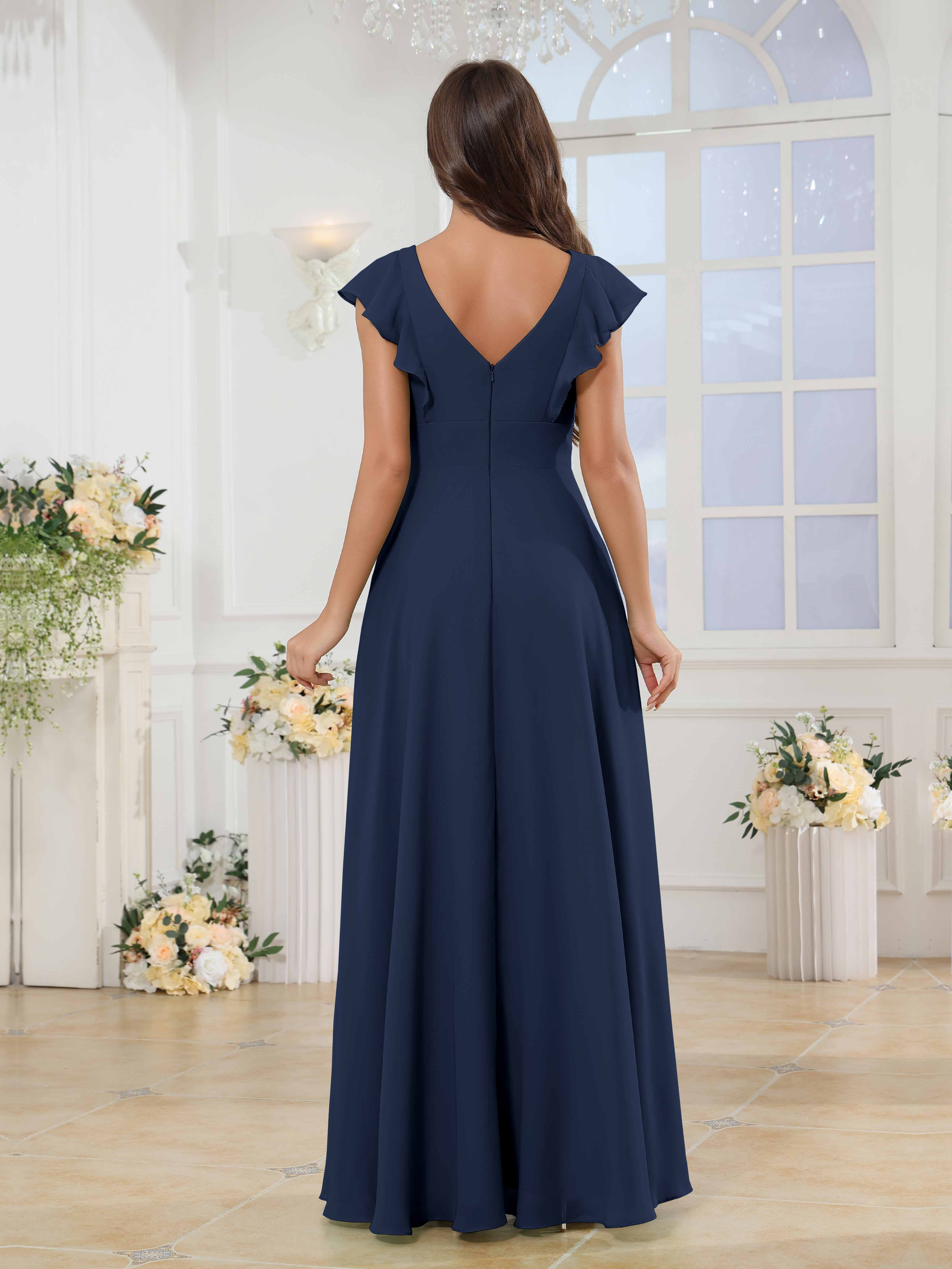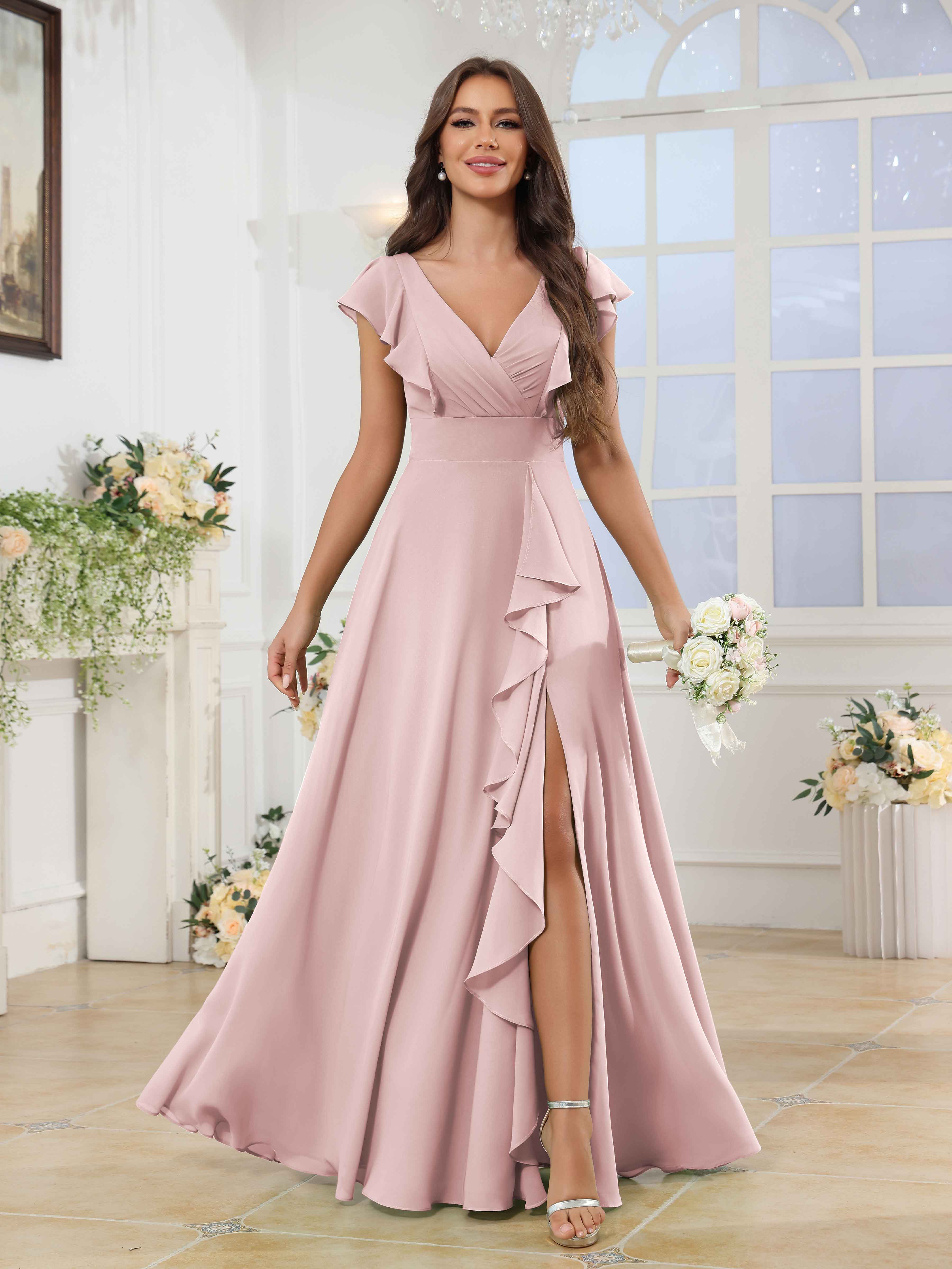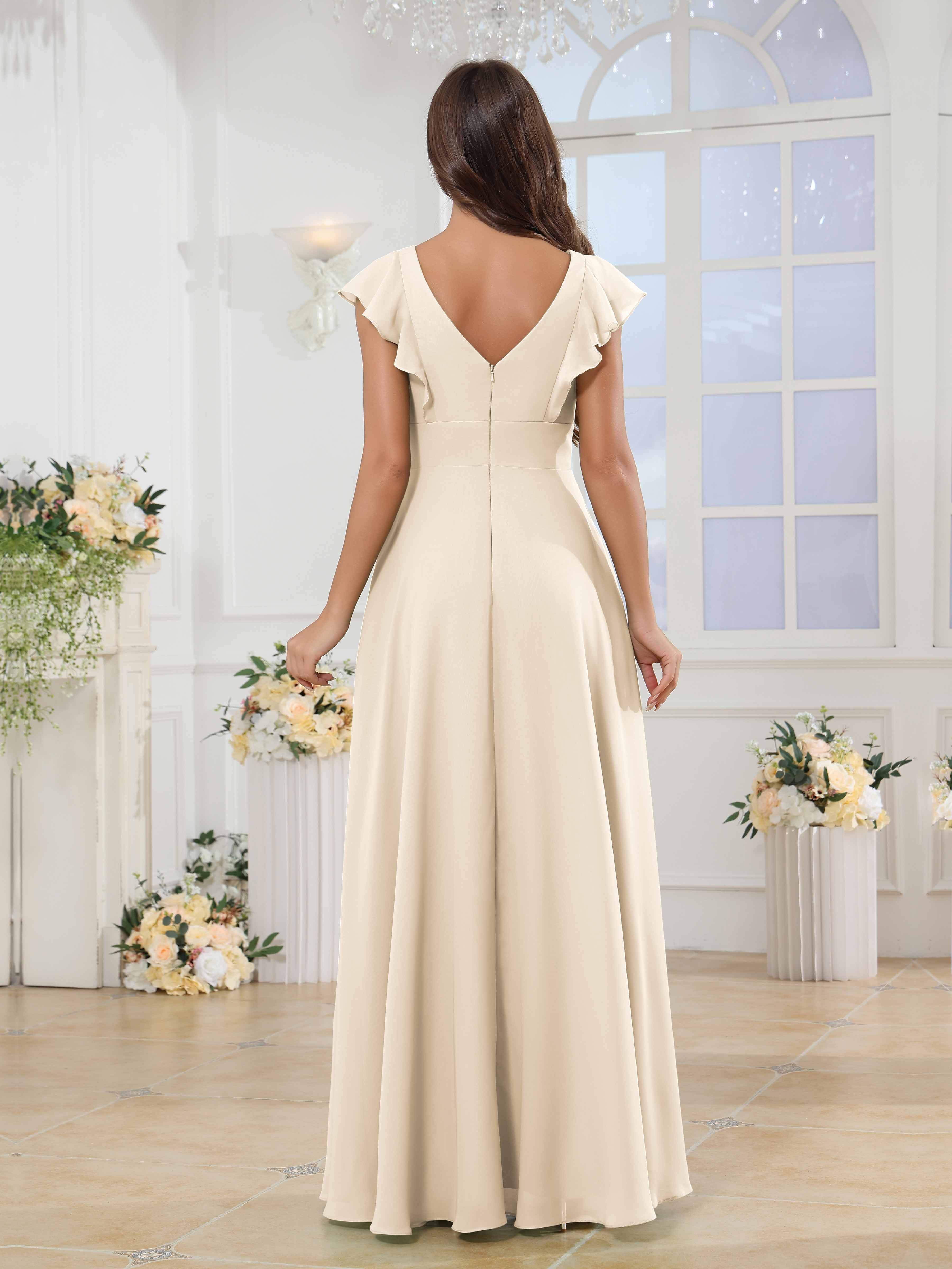 Roselyn Trendy V-Neck Ruffles Long Chiffon Bridesmaid Dresses With Pockets