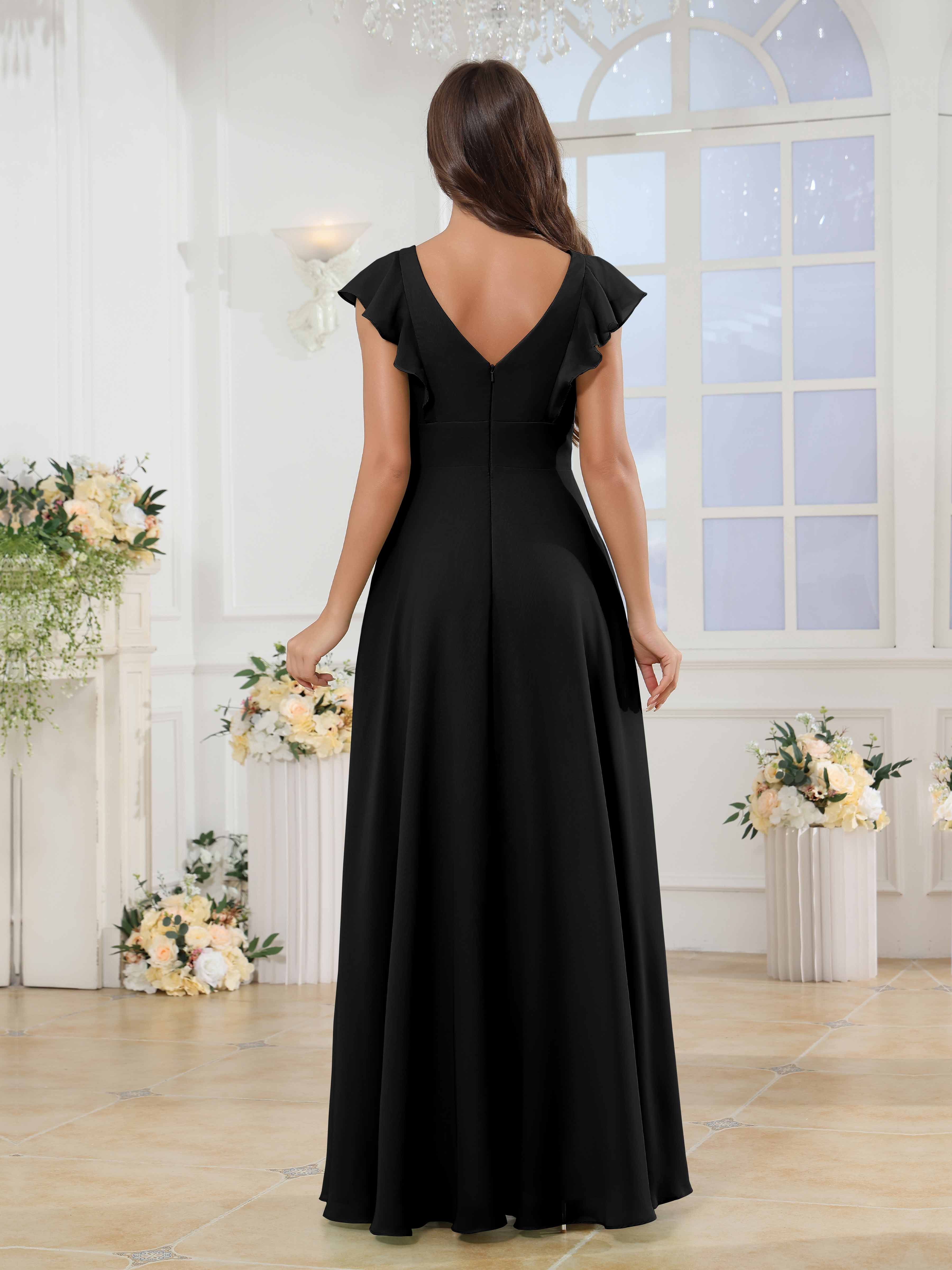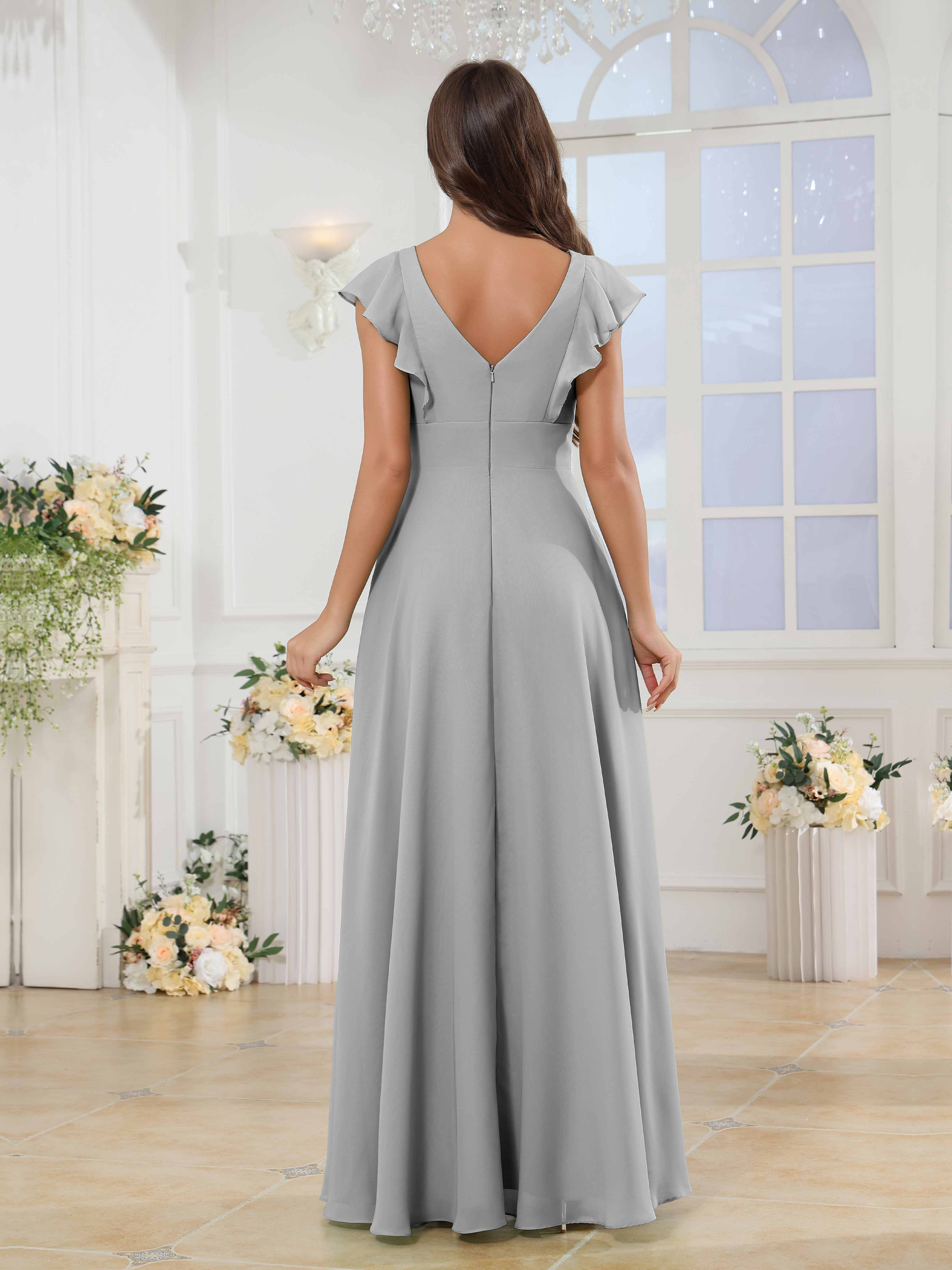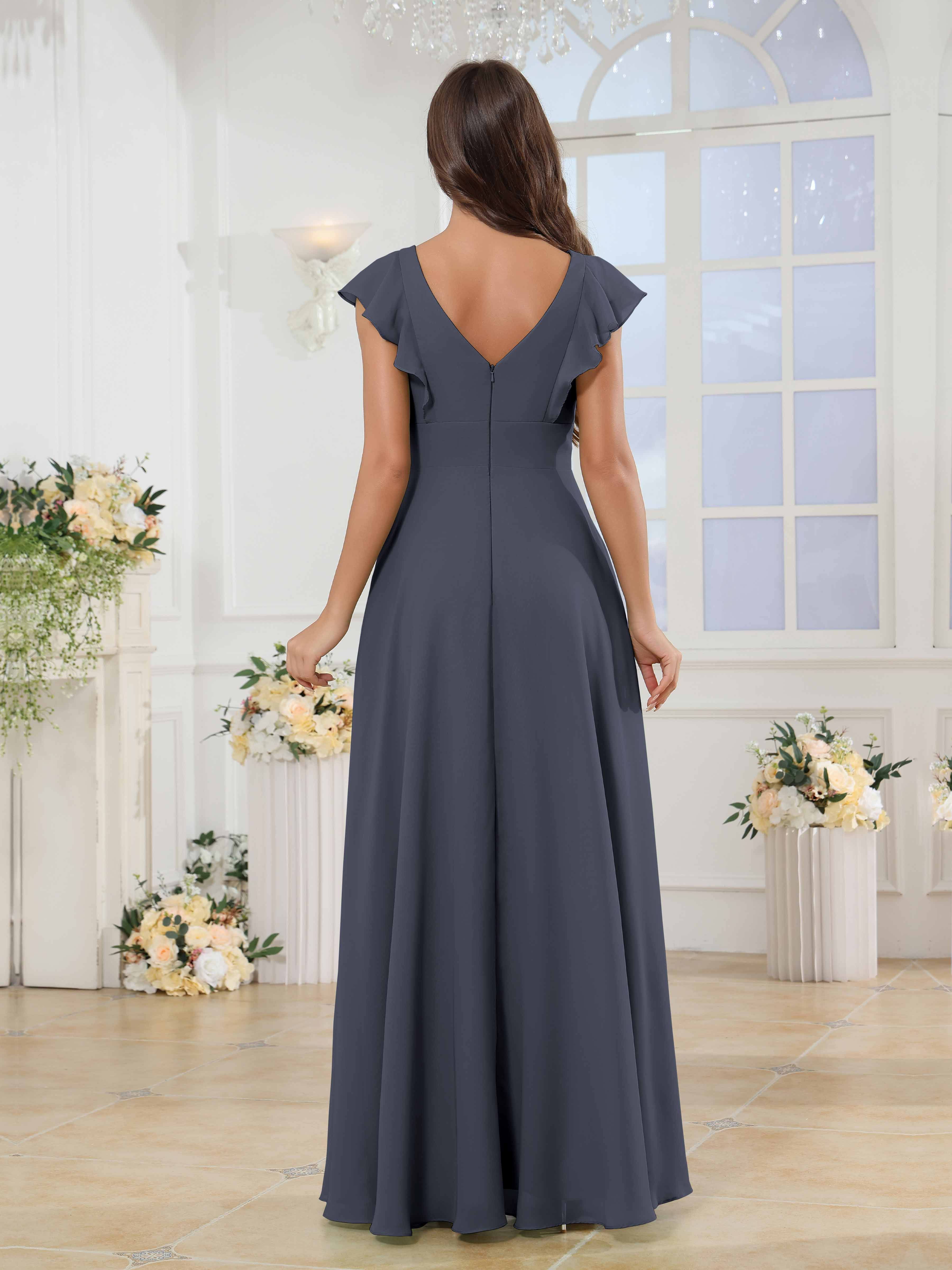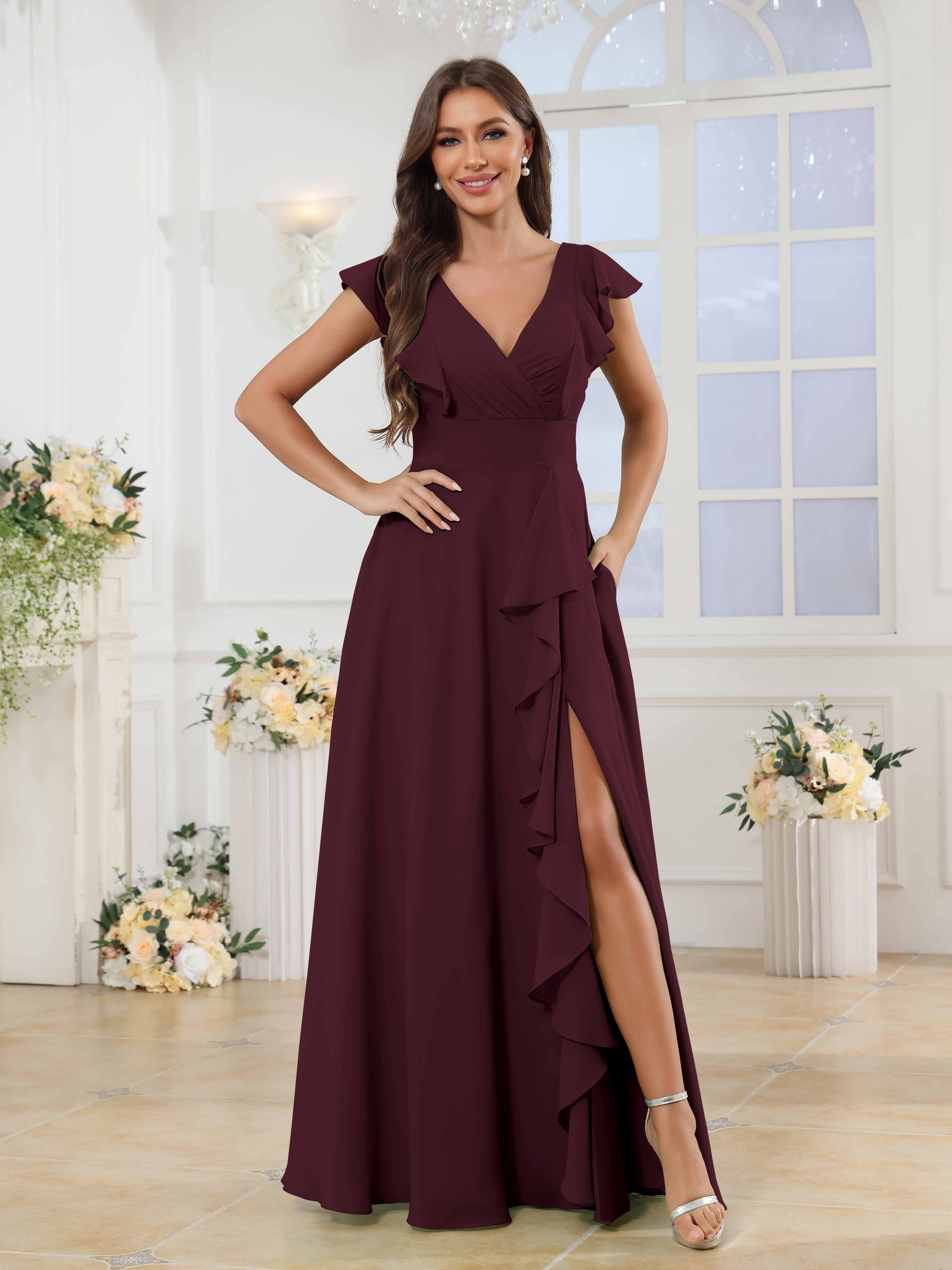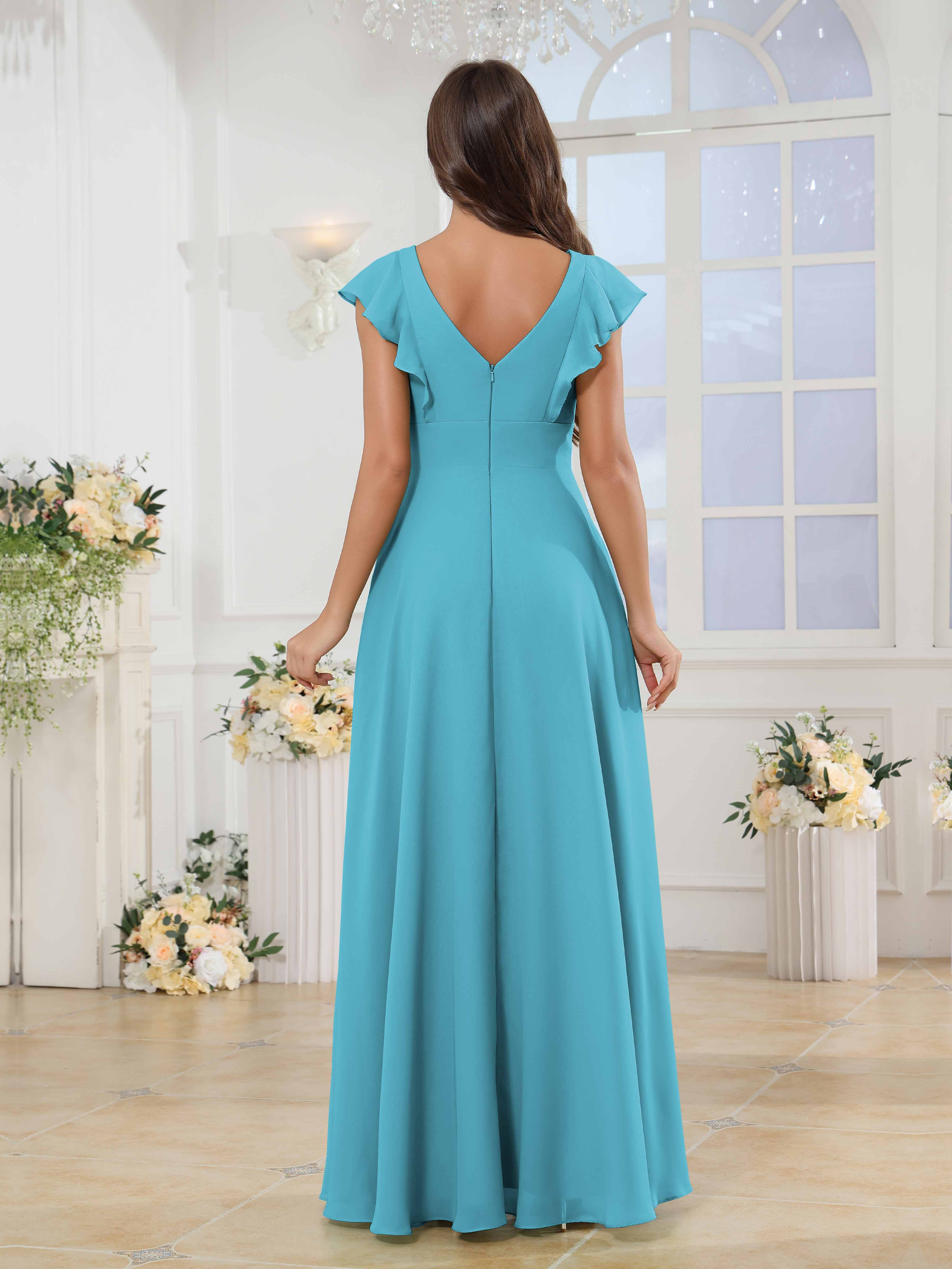Roselyn Trendy V-Neck Ruffles Long Chiffon Bridesmaid Dresses With Pockets