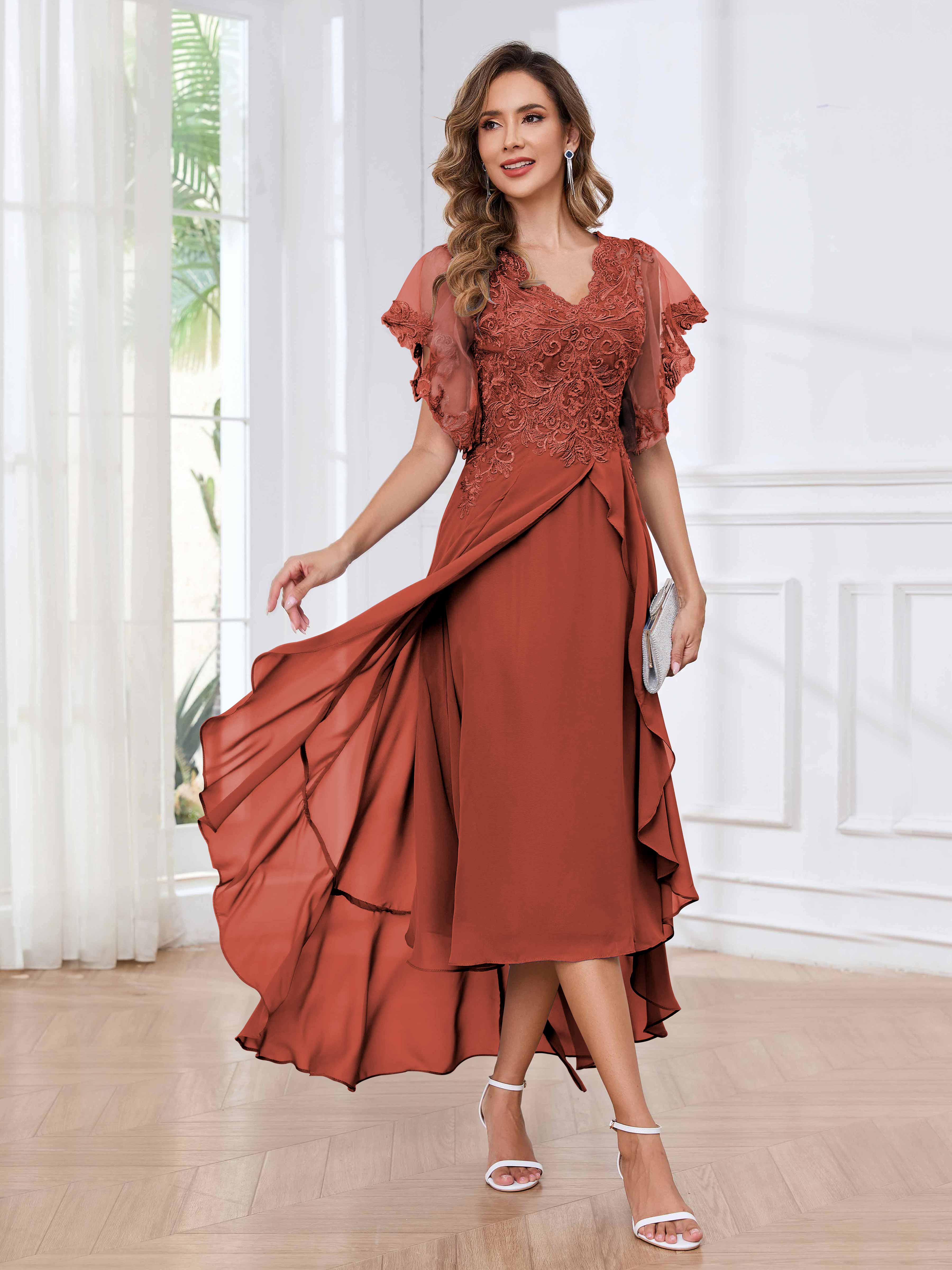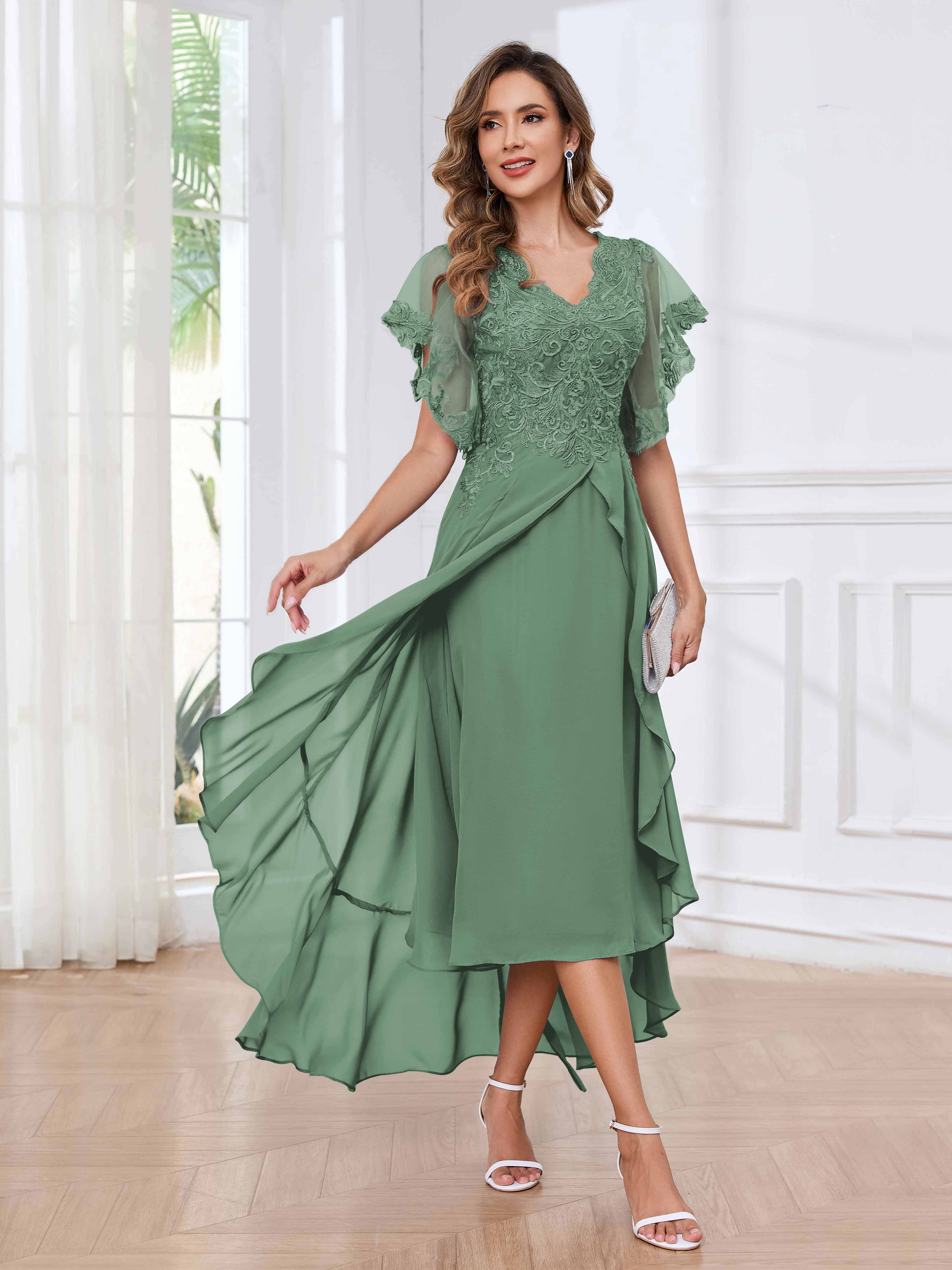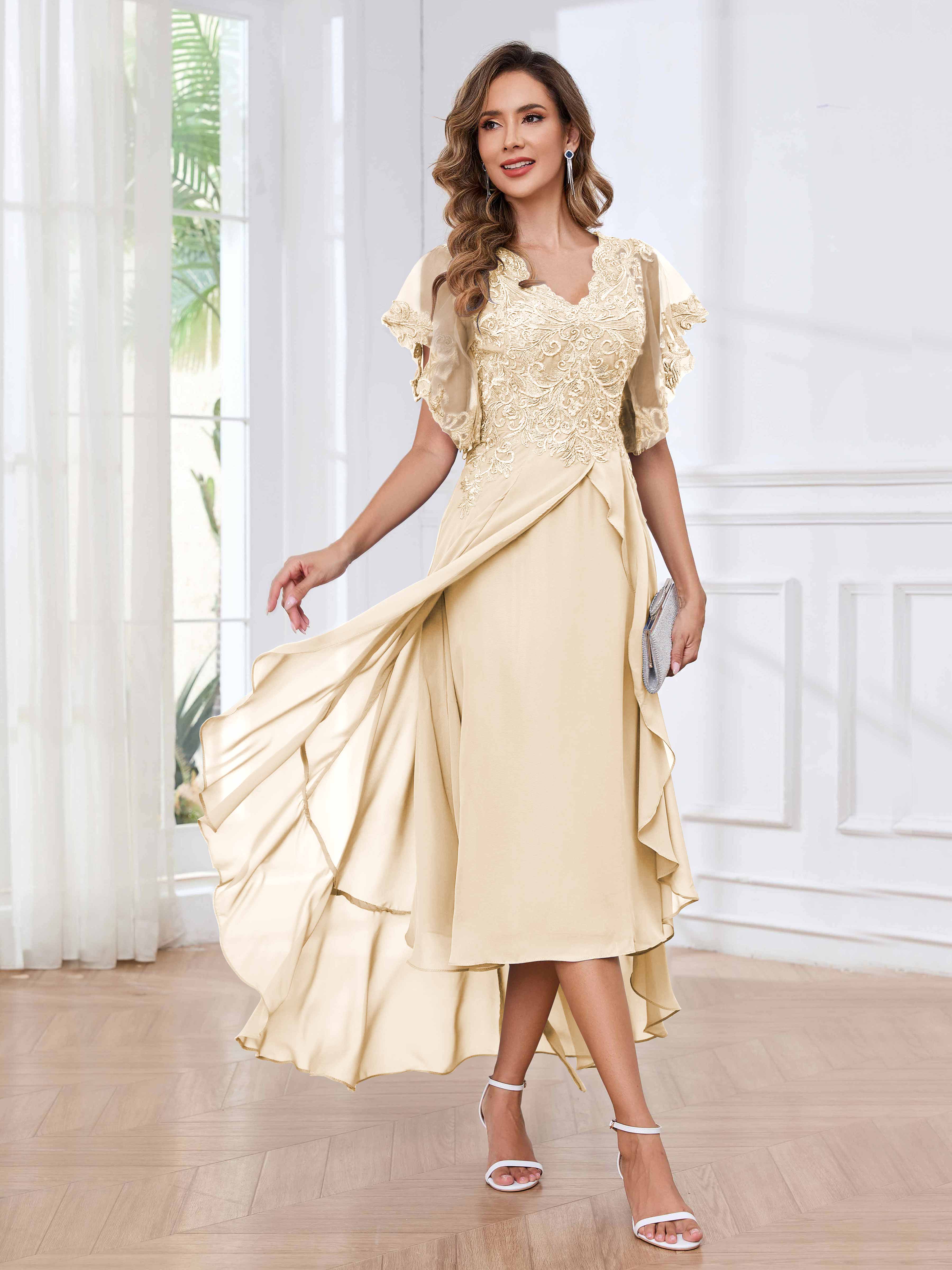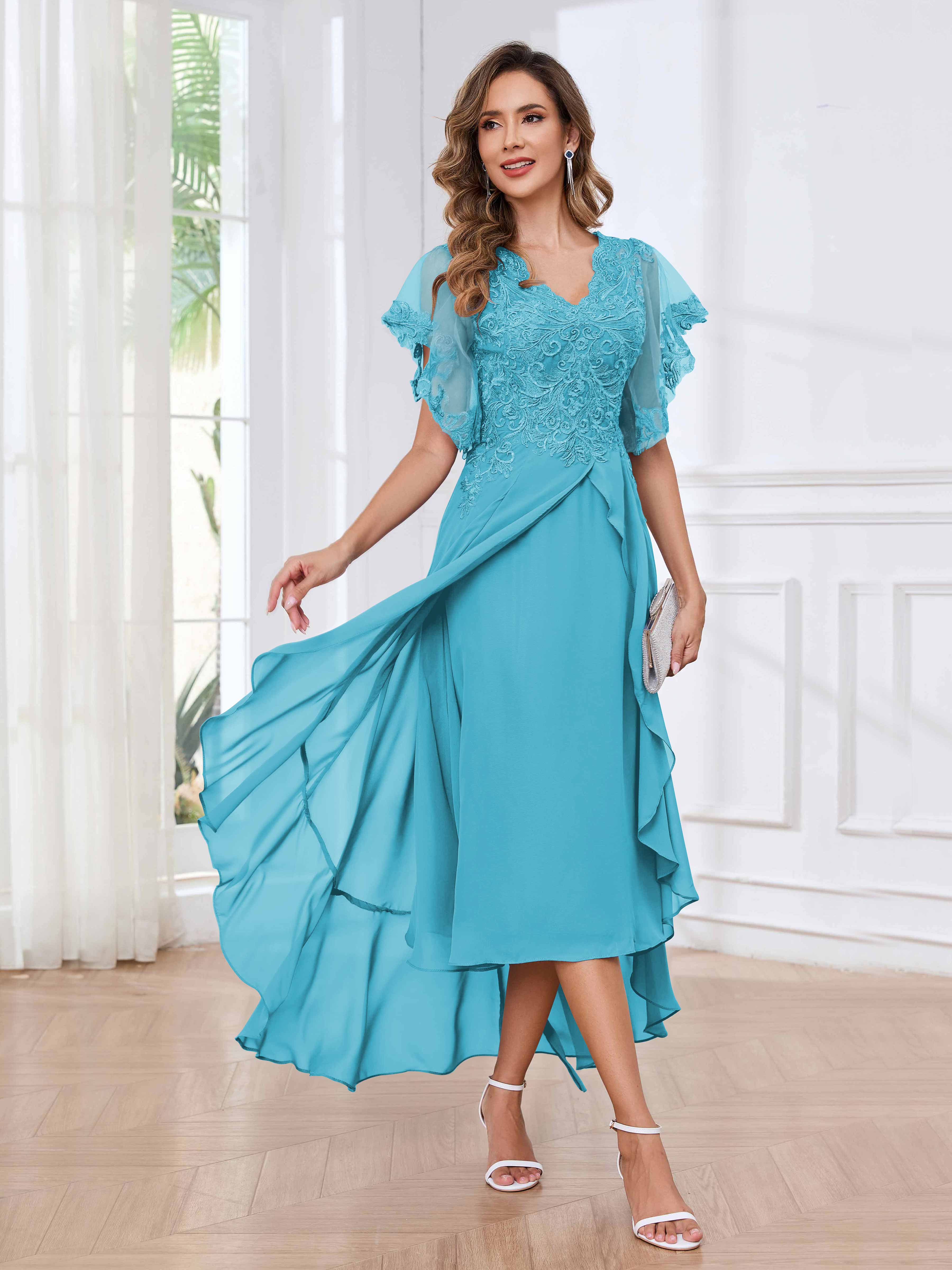 Sasha Stylish V Neck Short Sleeves Ruffles Appliques Mother of The Bride Dresses