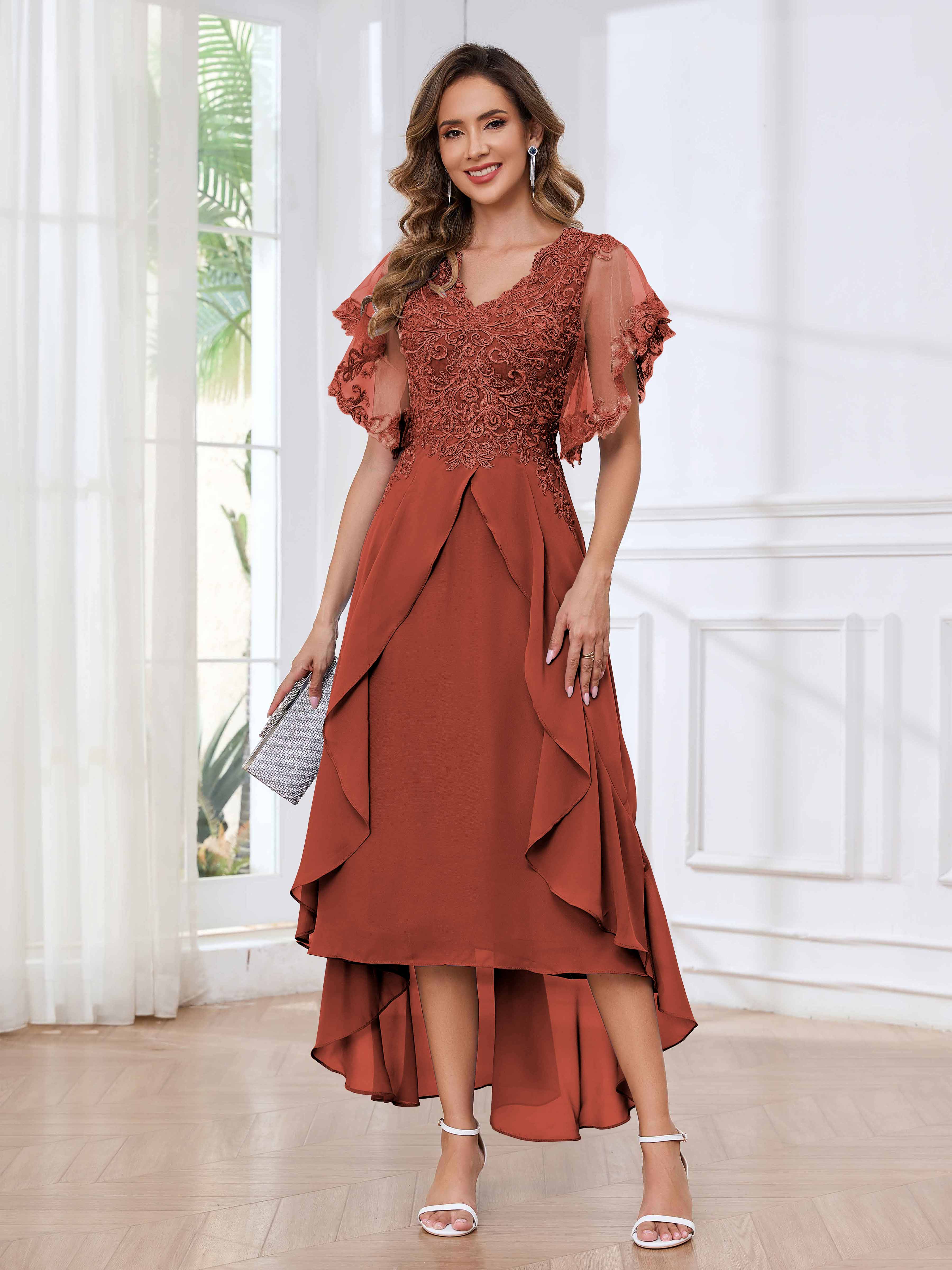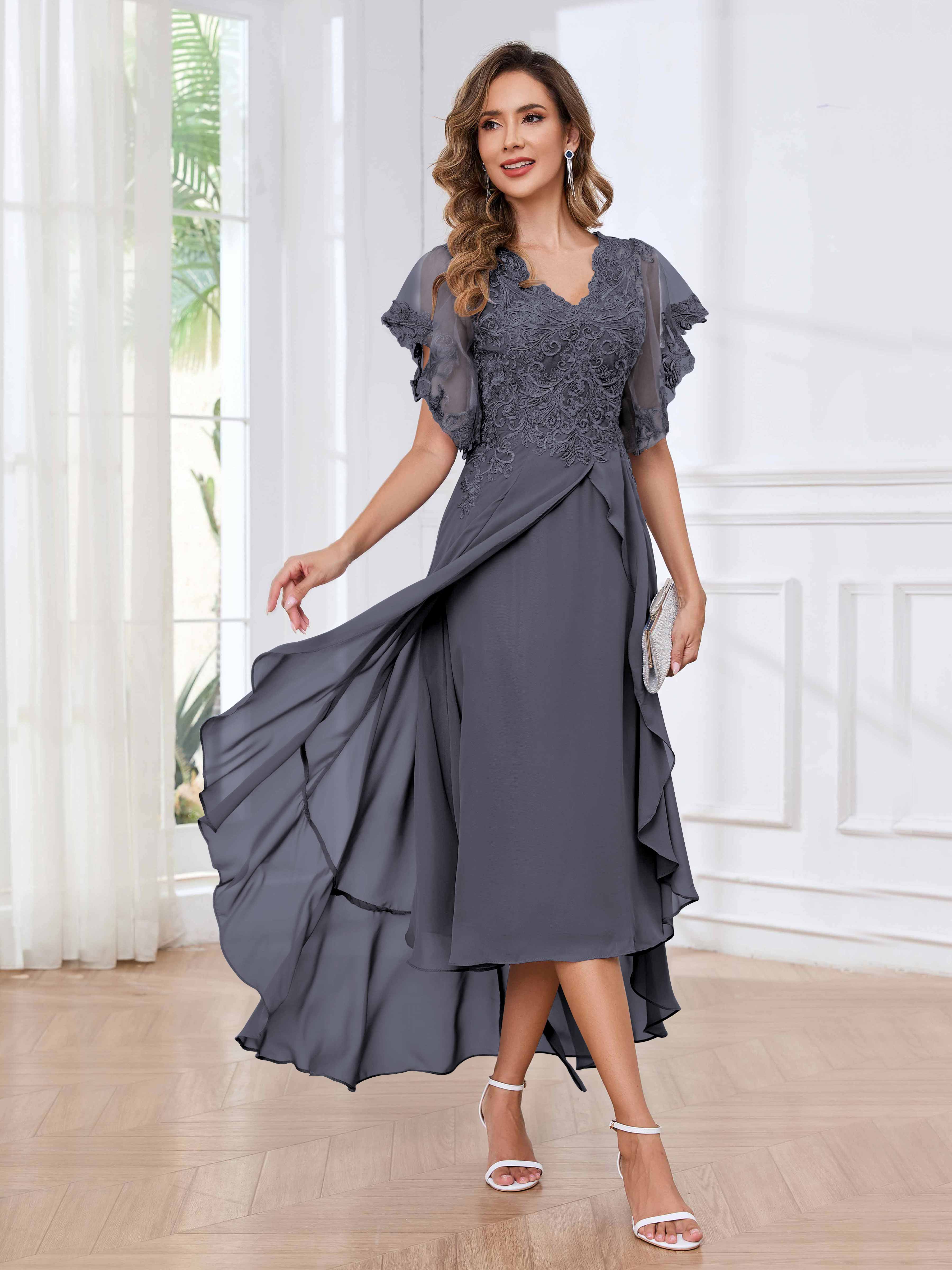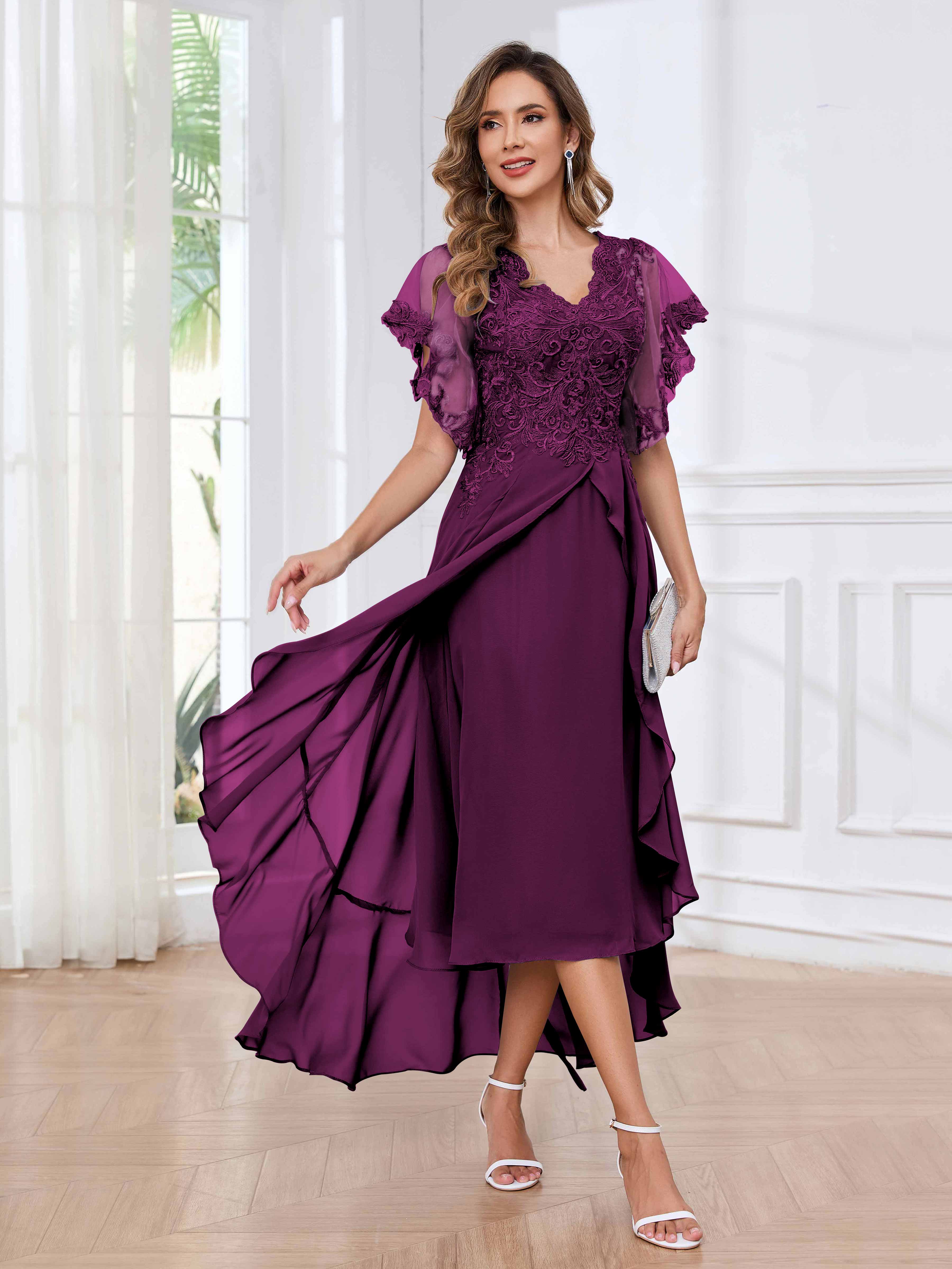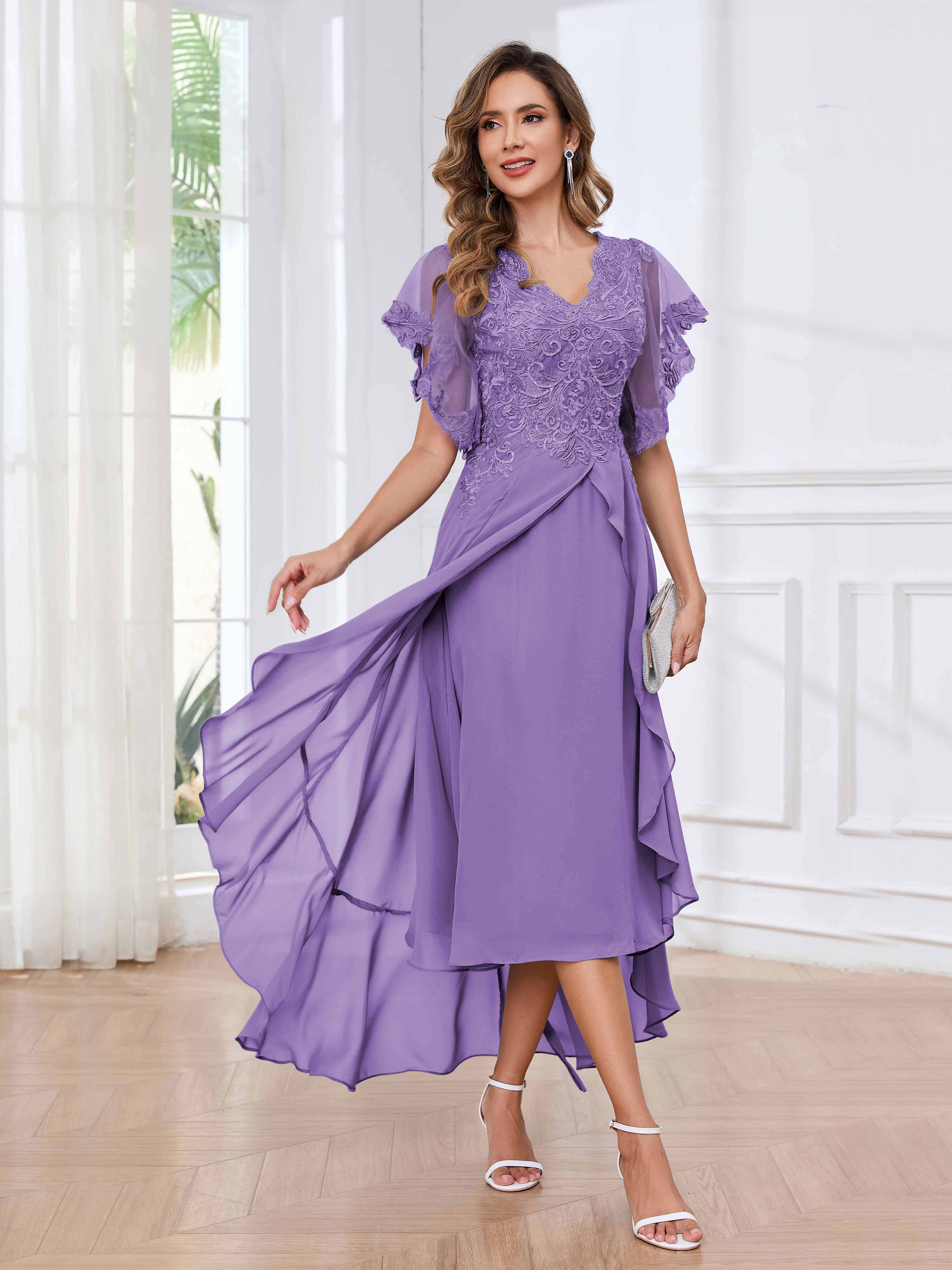Sasha Stylish V Neck Short Sleeves Ruffles Appliques Mother of The Bride Dresses