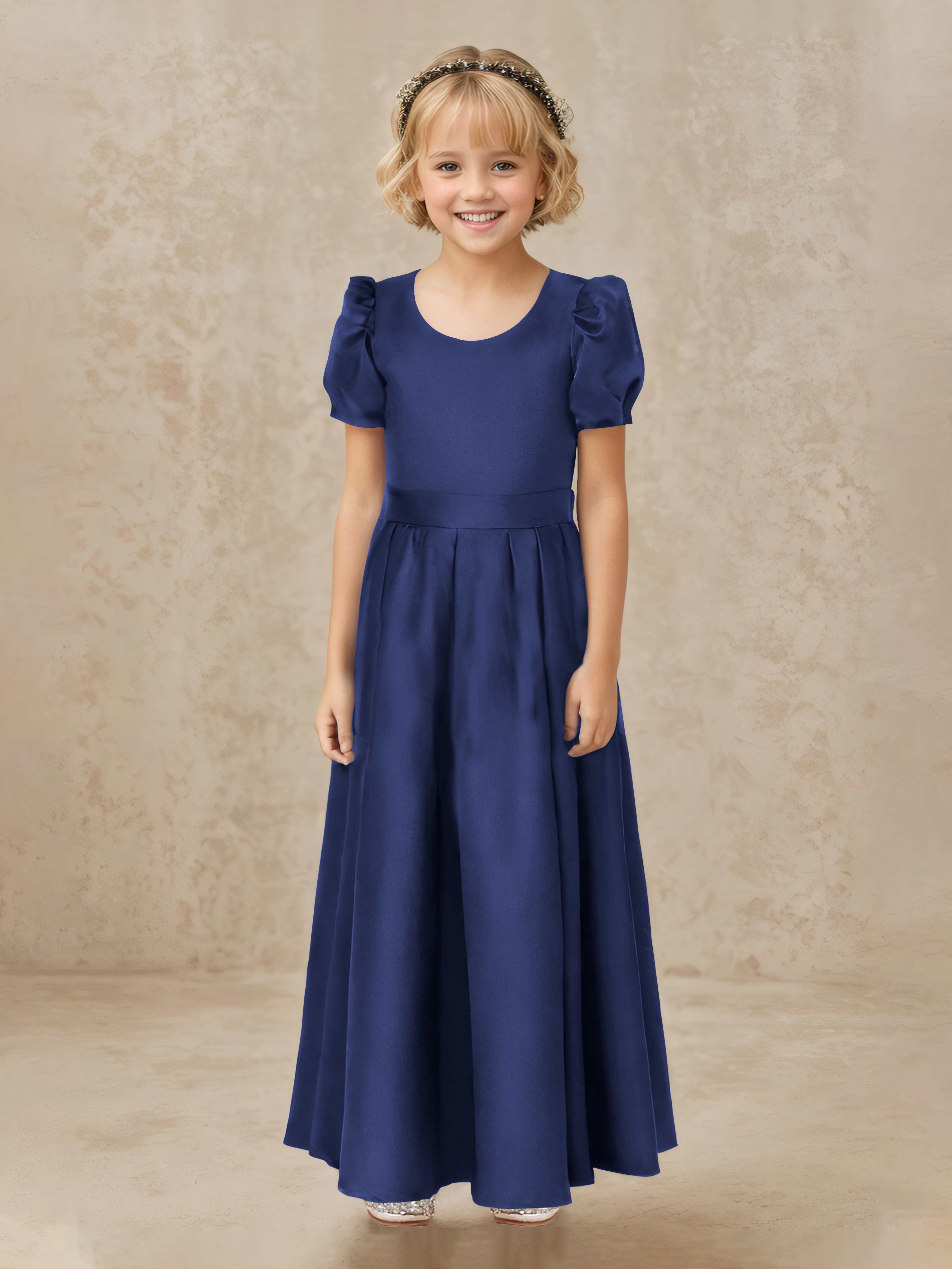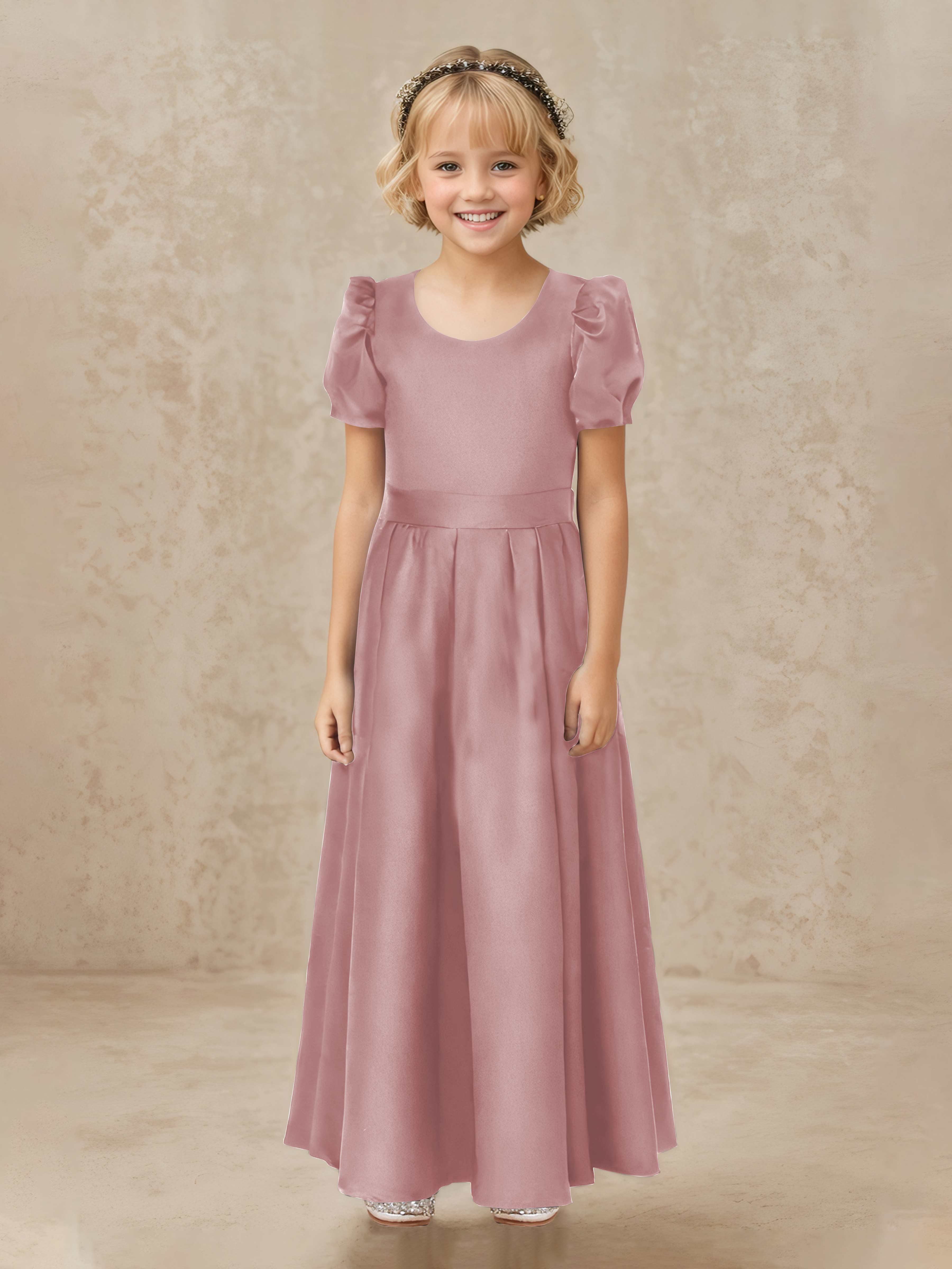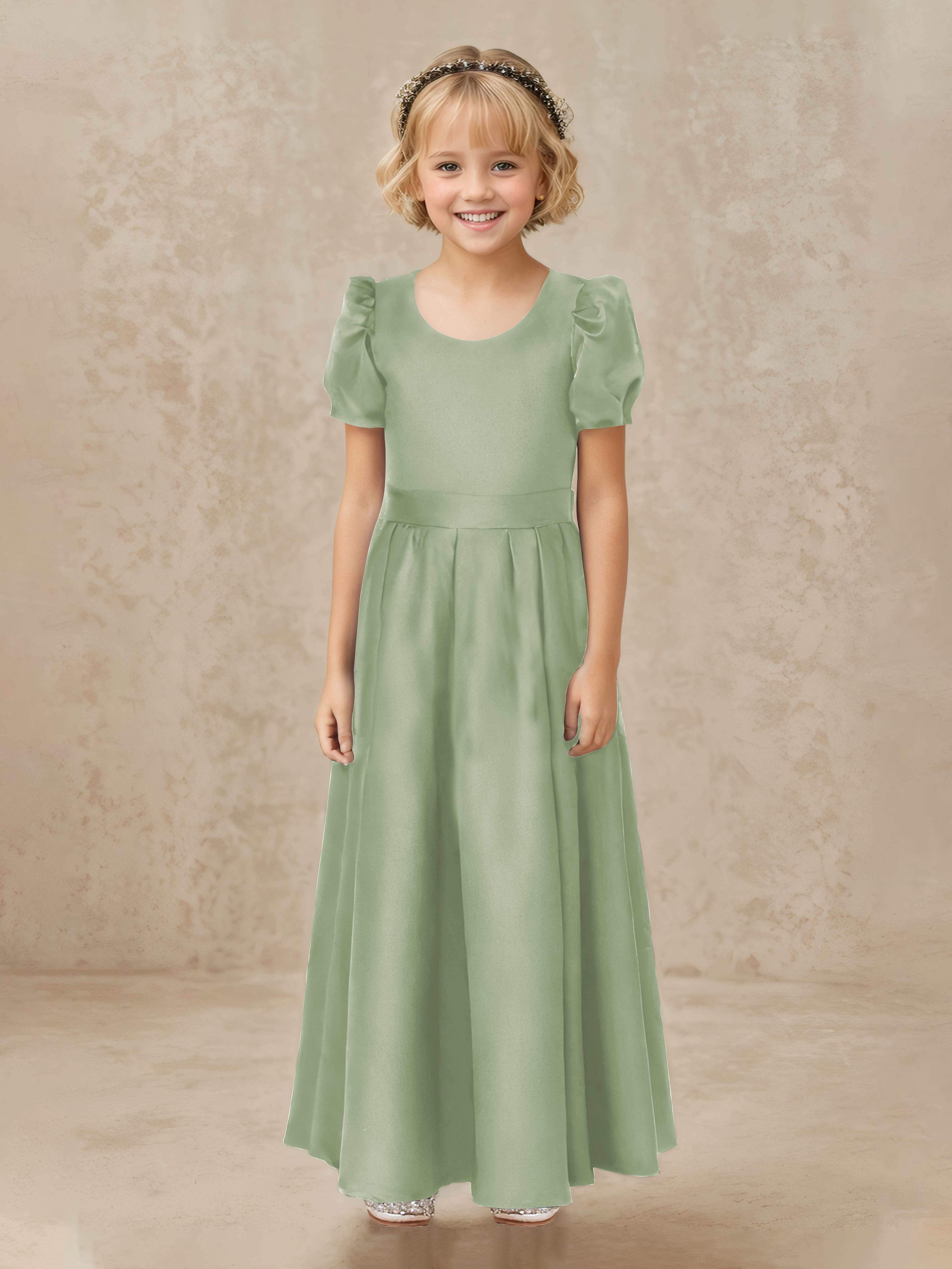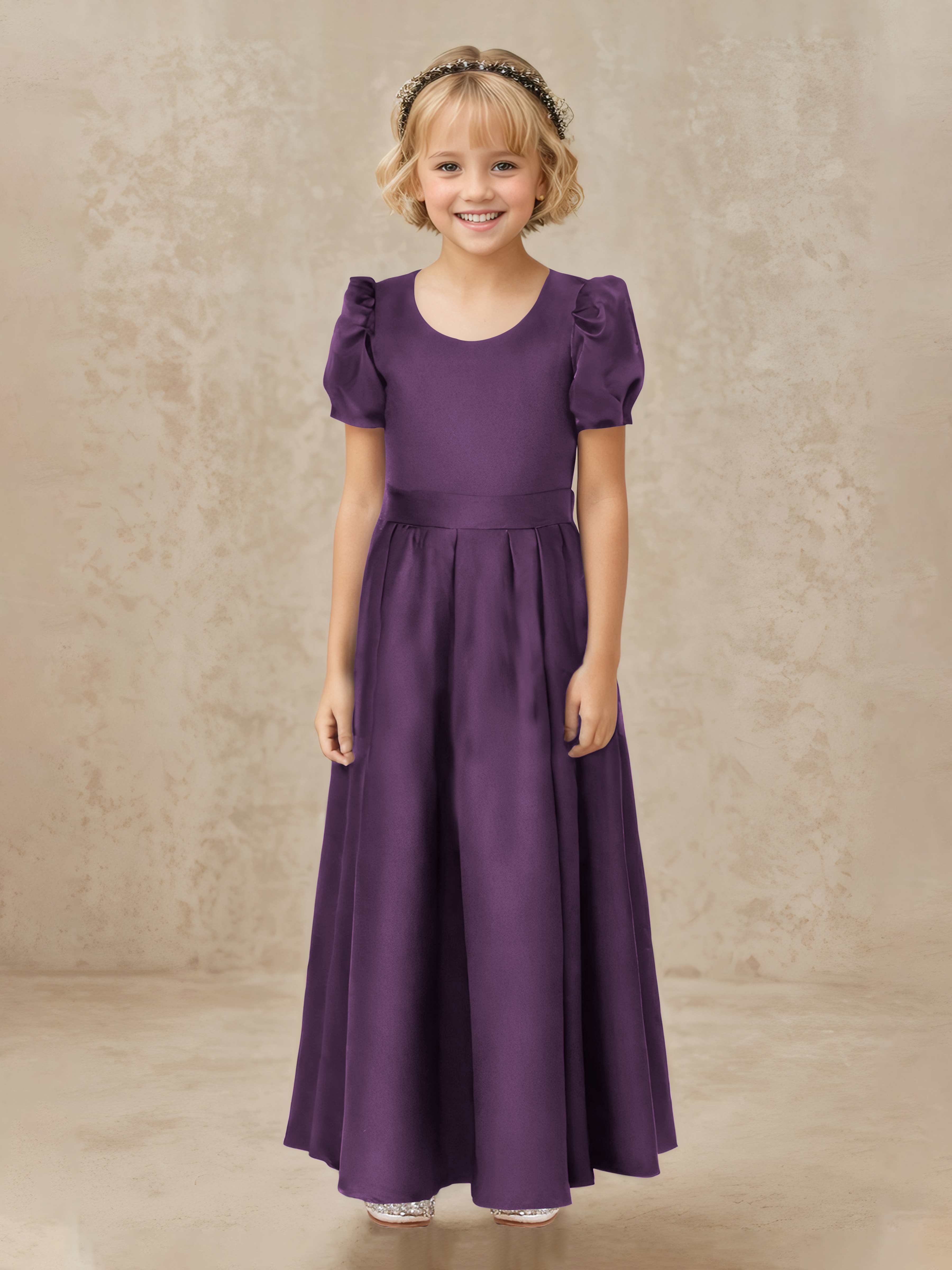 Simple A-Line Round Neck Satin Long Flower Girl Dresses