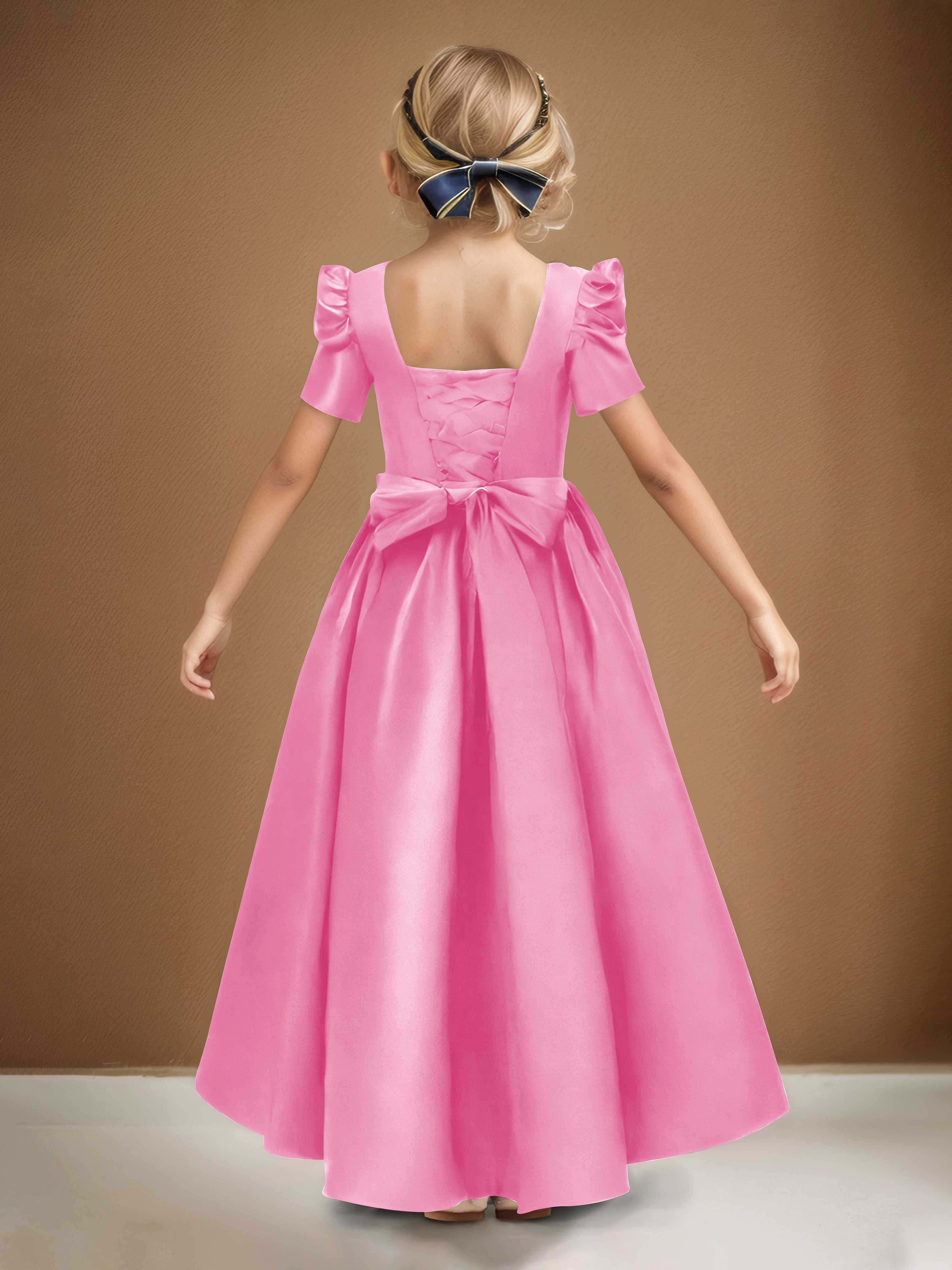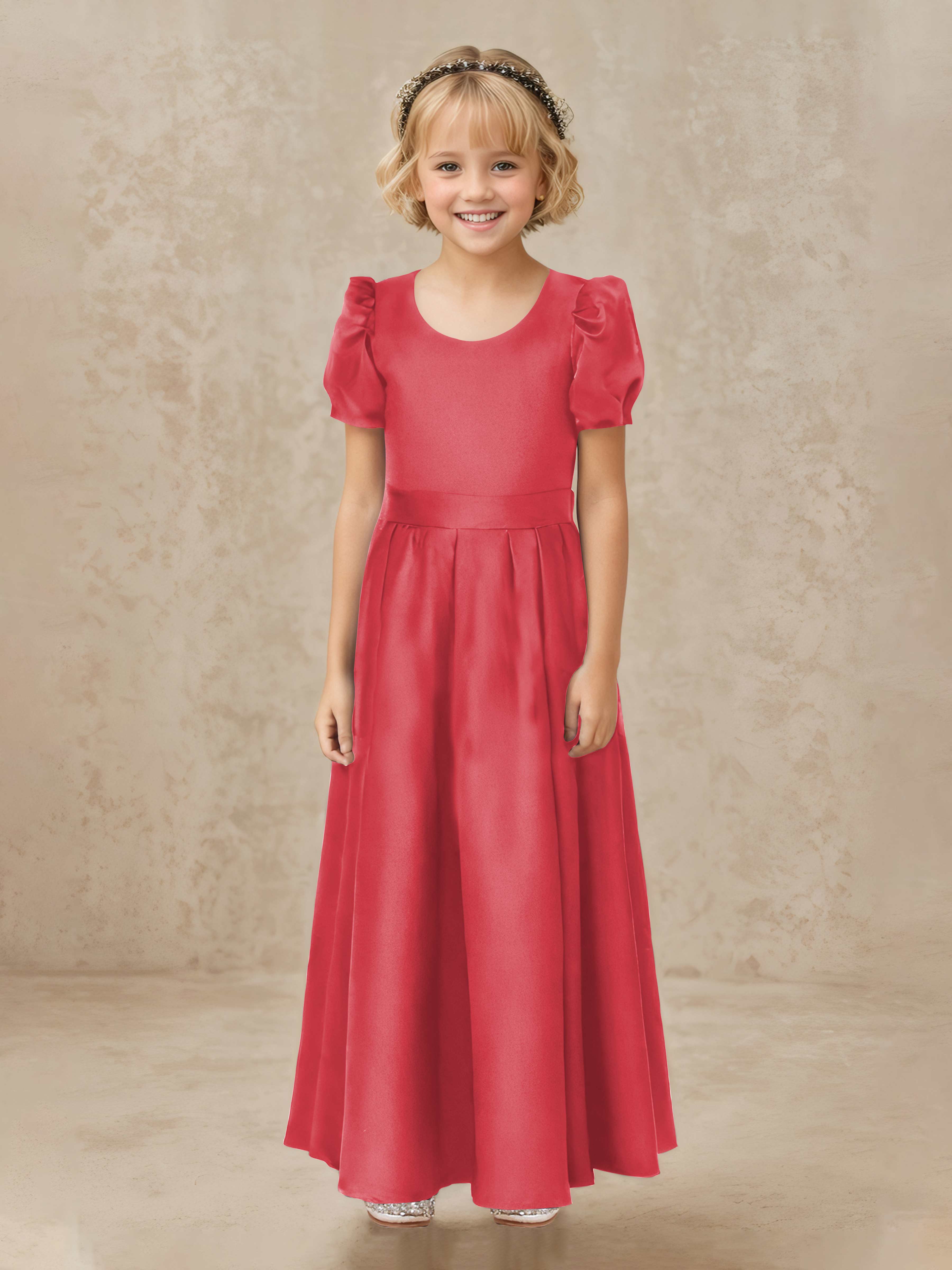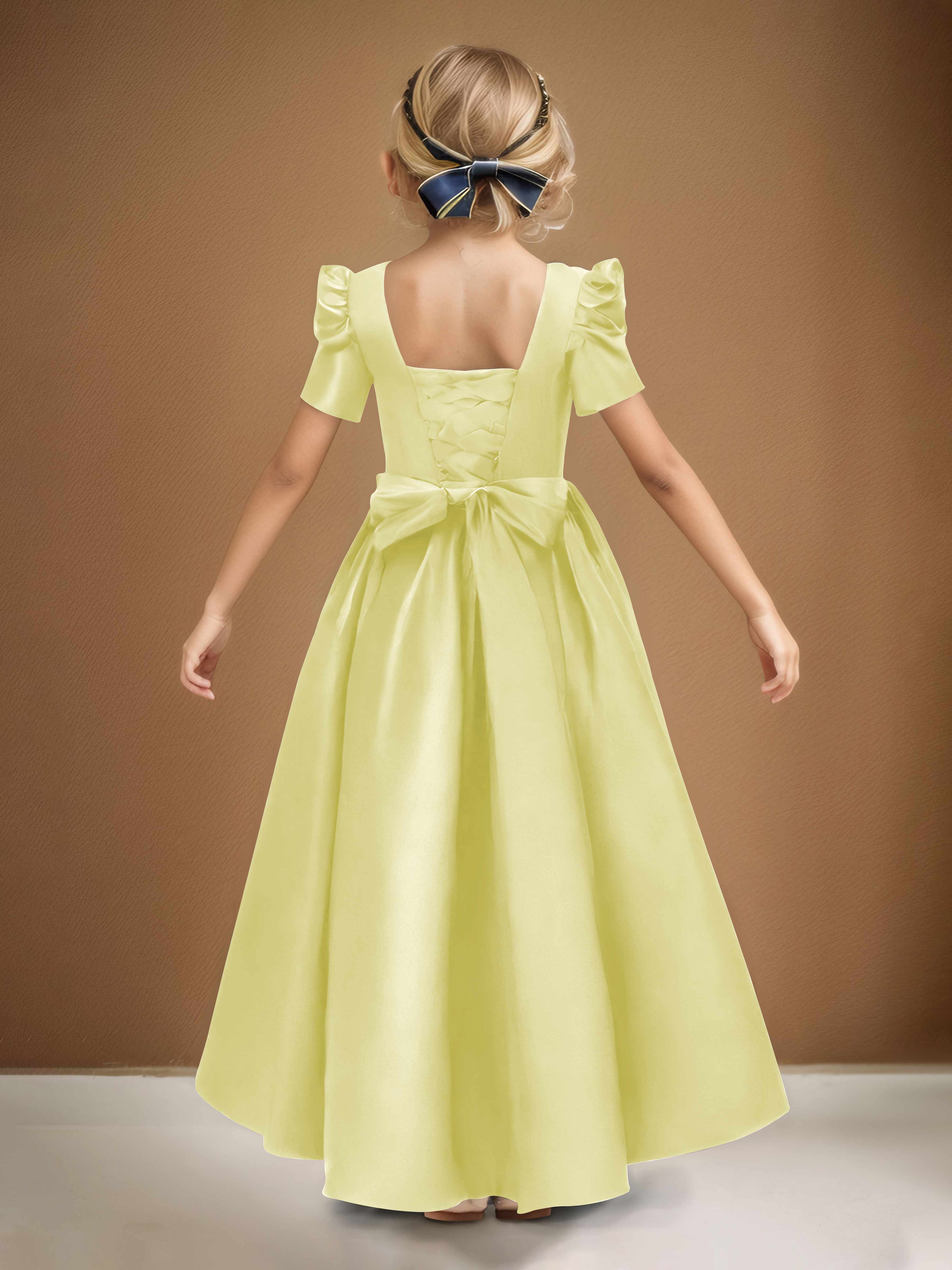 Simple A-Line Round Neck Satin Long Flower Girl Dresses