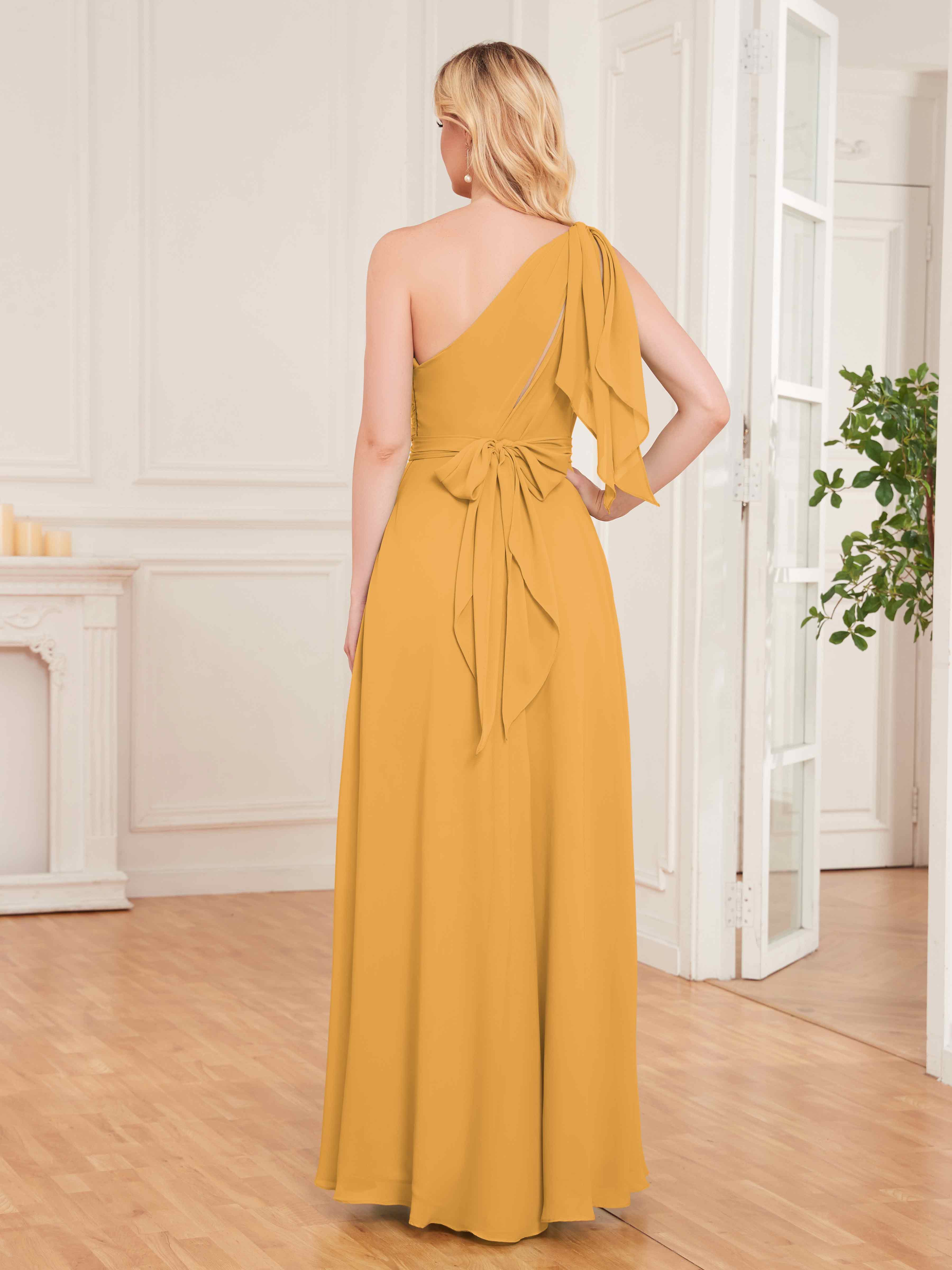 The Sloane is your one stop dress for a bold bridesmaid look! Quality and price meet with a luxurious chiffon silhouette, one shoulder neckline, floor length, and glamorous bow belt. Step boldly down the aisle with affordable style and grace.