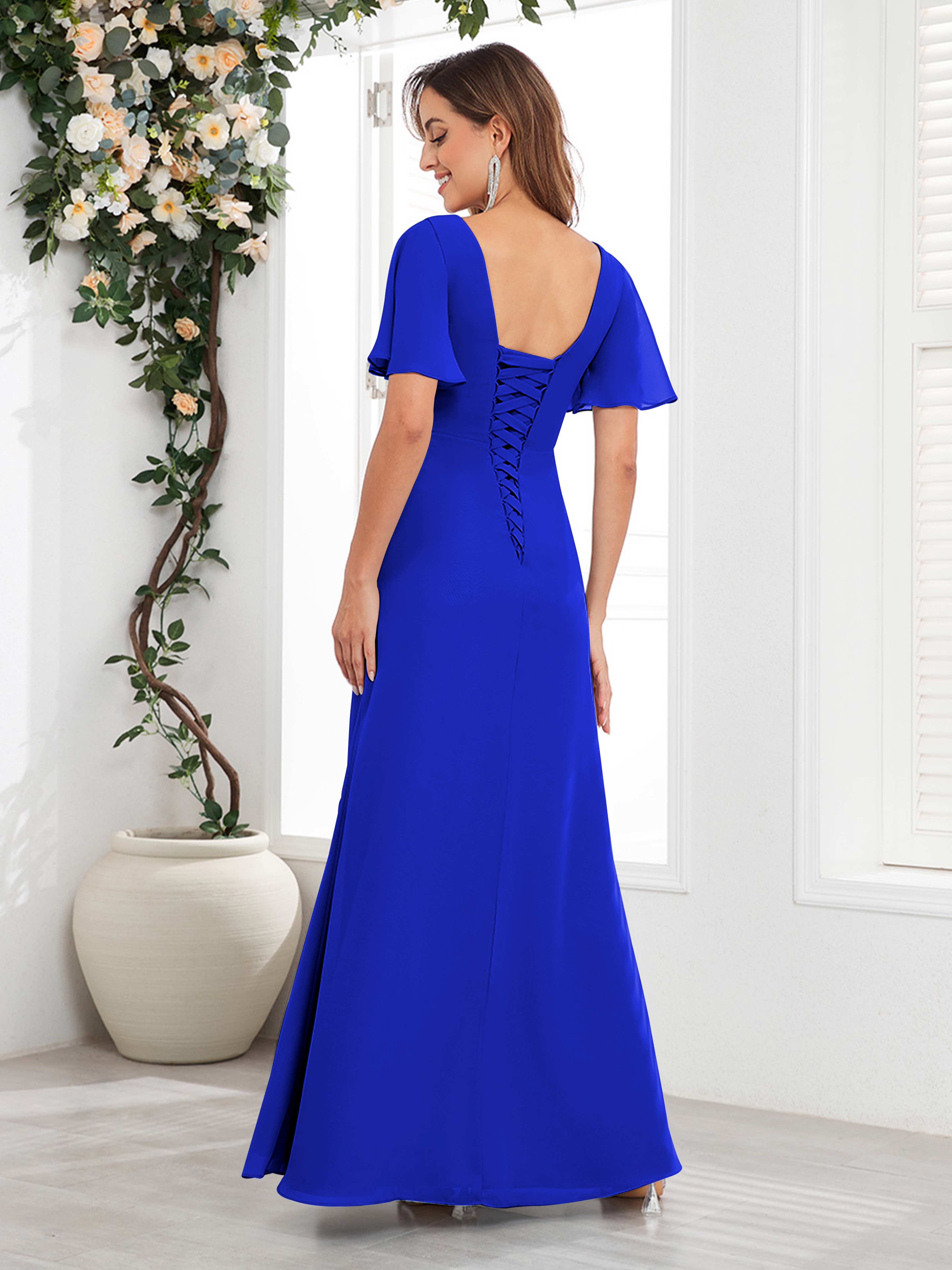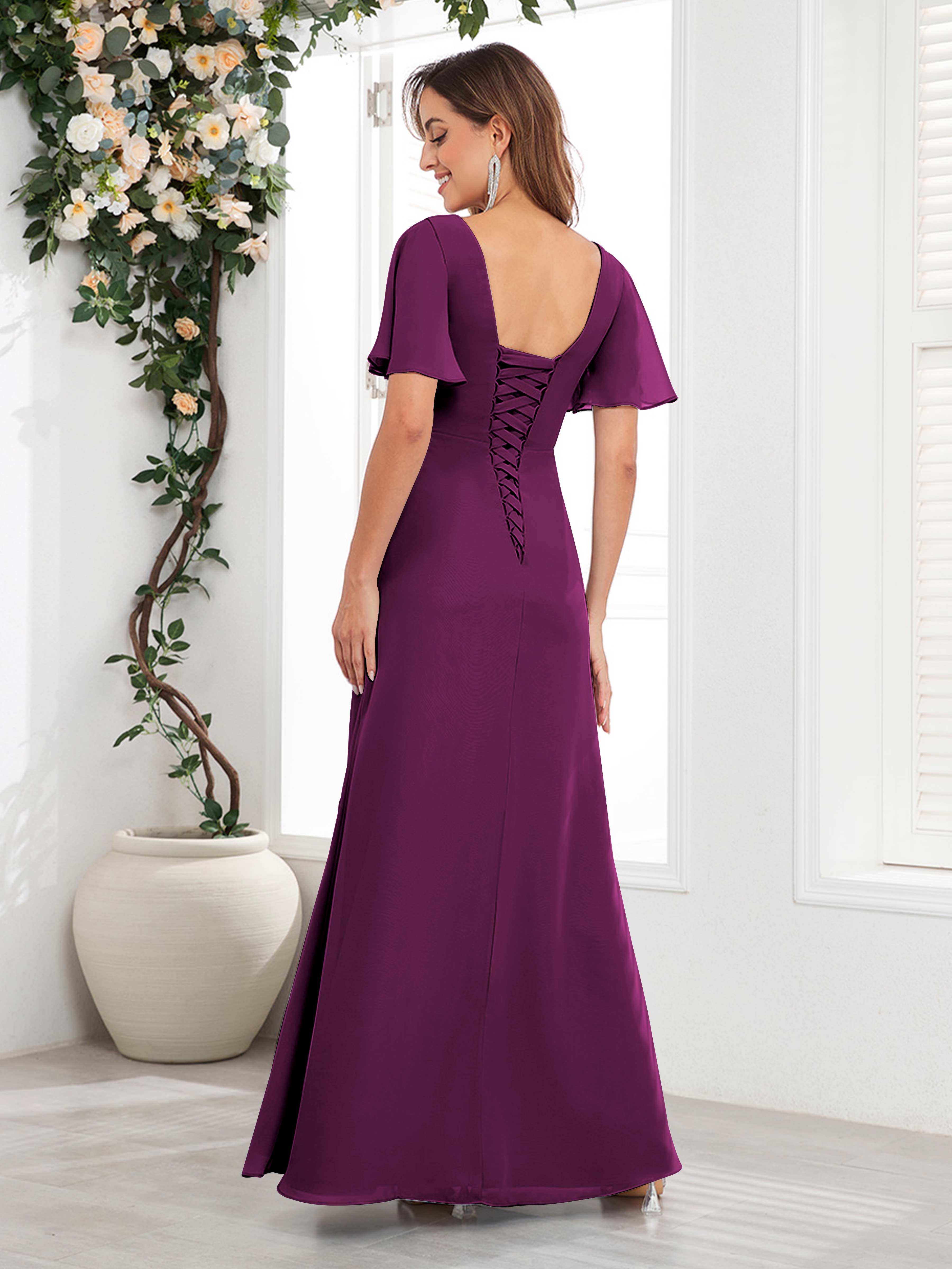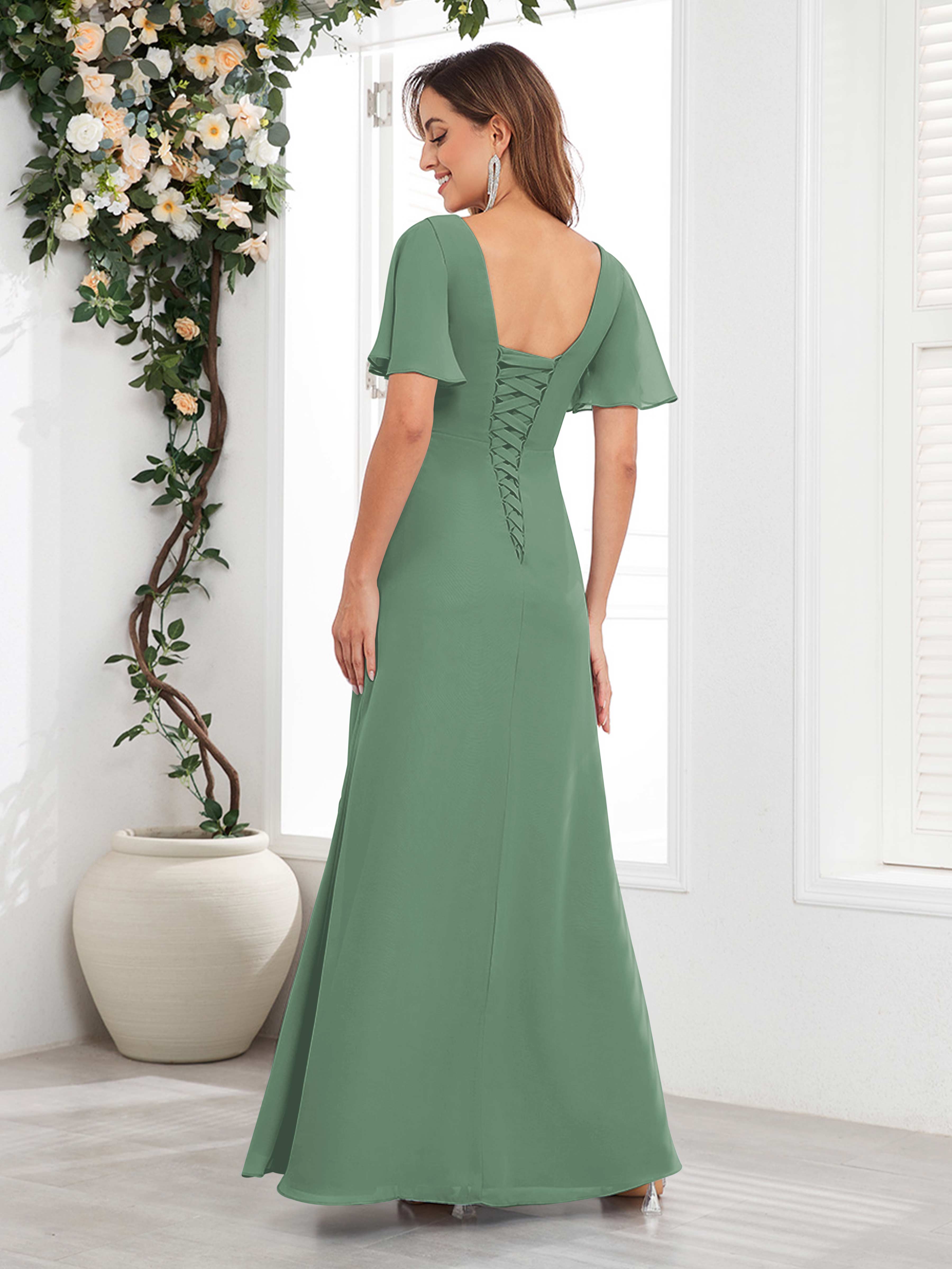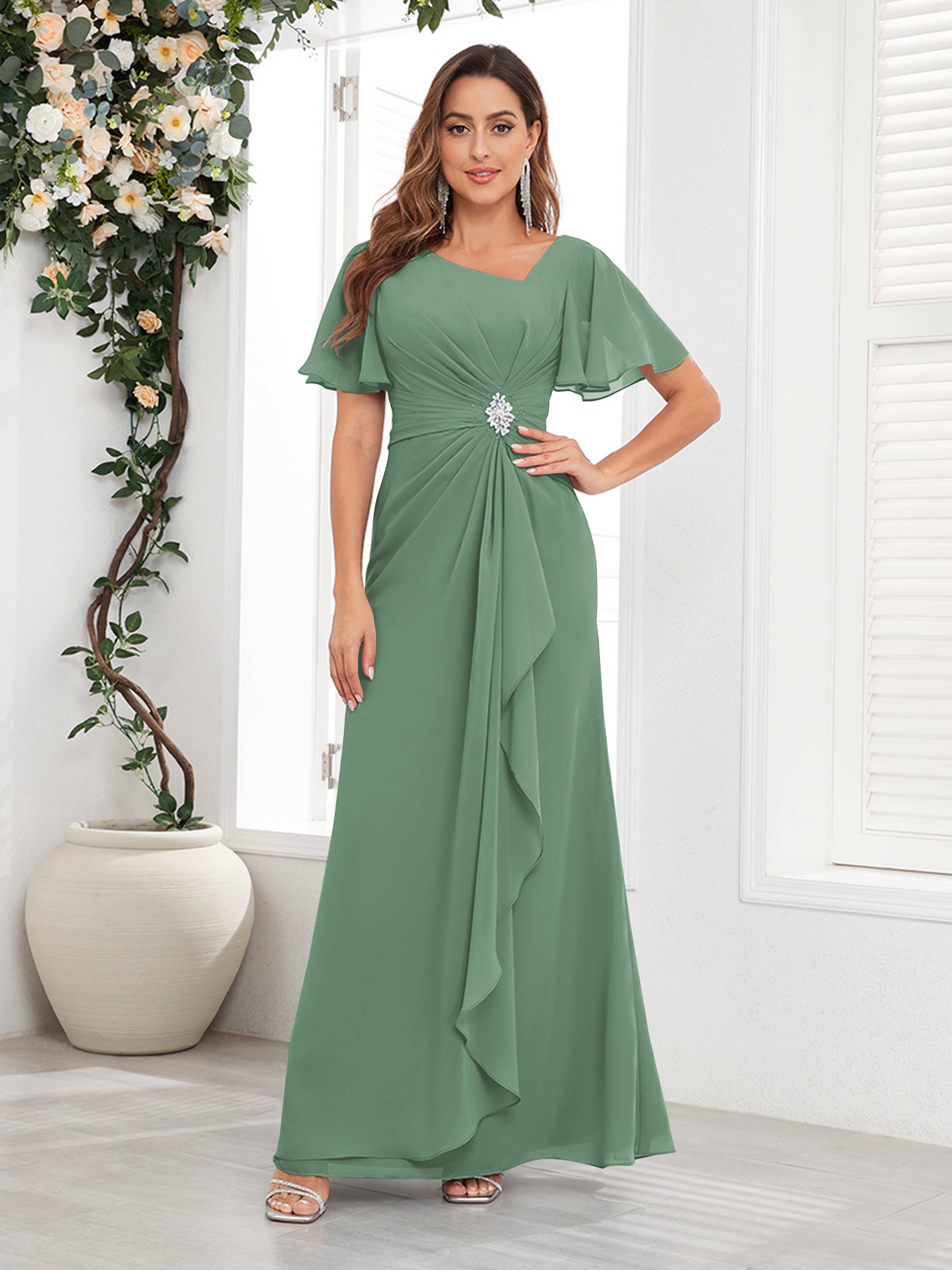 Wrenley Graceful A-Line V Neck Ruffles Beaded Long Chiffon Mother Of The Bride Dresses